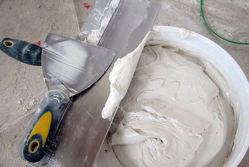 Вяжущим элементом выступает строительный гипс. Средство применяют в основном под окраску стен в сухих помещениях. Особенность материала позволяет выравнивать стены до получения почти идеально ровного покрытия без следов от шпателя и разводов. Гипсовая шпатлевка быстро высыхает и не дает усадки. Из-за скорости высыхания гипсовые смеси замешивают маленькими порциями и сразу же наносят. При этом процесс высыхания можно будет уловить зрительно. В штукатурку на основе гипса не добавляют токсичных и агрессивных химических добавок, поэтому область применения включает помещения разного предназначения. Используют гипсовый материал в детских комнатах, садиках, санаториях, больницах. В то же время он не годится для обработки наружных стен и покрытий в ванной комнате. От влаги эта разновидность отделки набухает и отслаивается.
