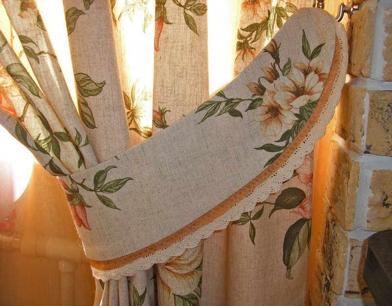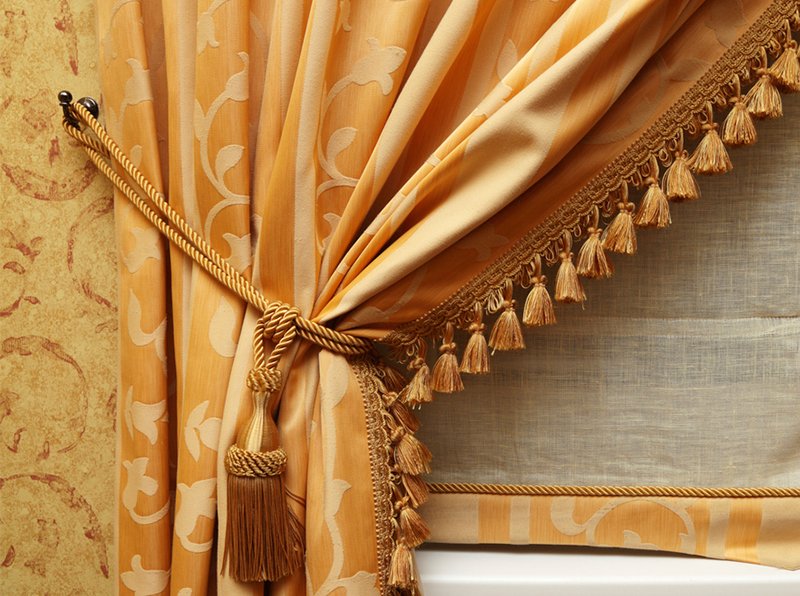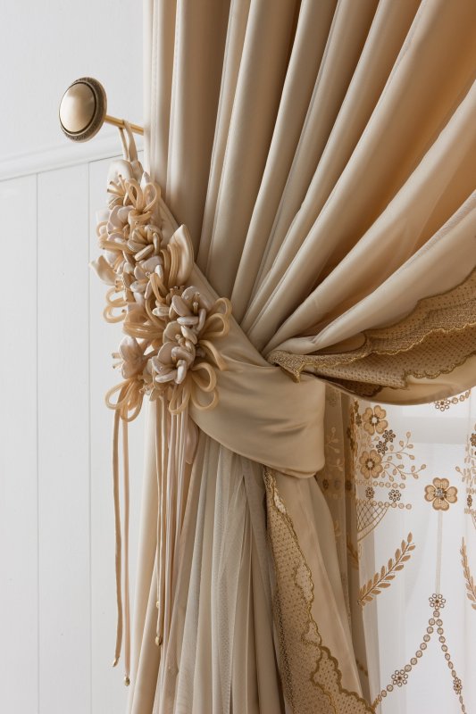 Для максимально гармоничного оформления фурнитура подбирается под фактуру и «статус» портьер. Легкие, полупрозрачные занавески подпоясываются тонкими шнурками, простые льняные – более грубыми, толстыми. Роскошные, «богато» вышитые портьеры украшаются блестящими подхватами с кистями в тон шторам.