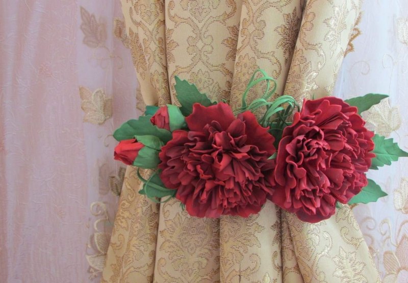 Фоамиран, также называемый ЭВА, пластичная замша, ревелюр, «фом» – это мягкий декоративный вспененный материал, используемый для рукоделия. Подхваты из него обычно украшаются вполне реалистичными цветами, целыми букетами, выполненными преимущественно в пастельных тонах. Подобное оформление отлично впишется в интерьеры классицизма, шебби-шика, барокко.