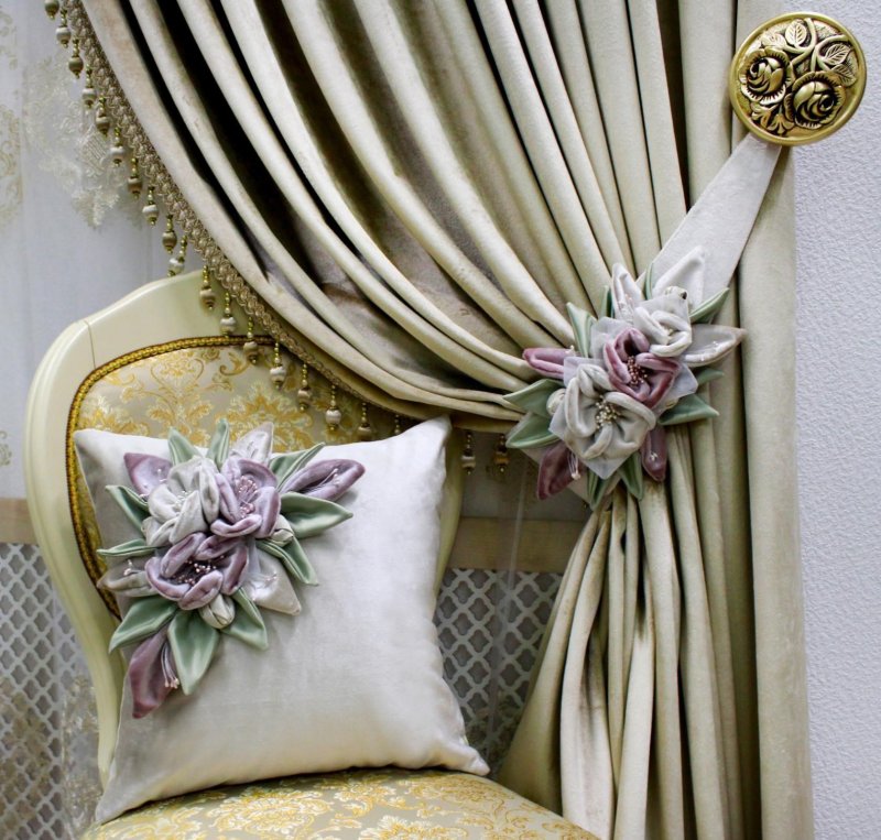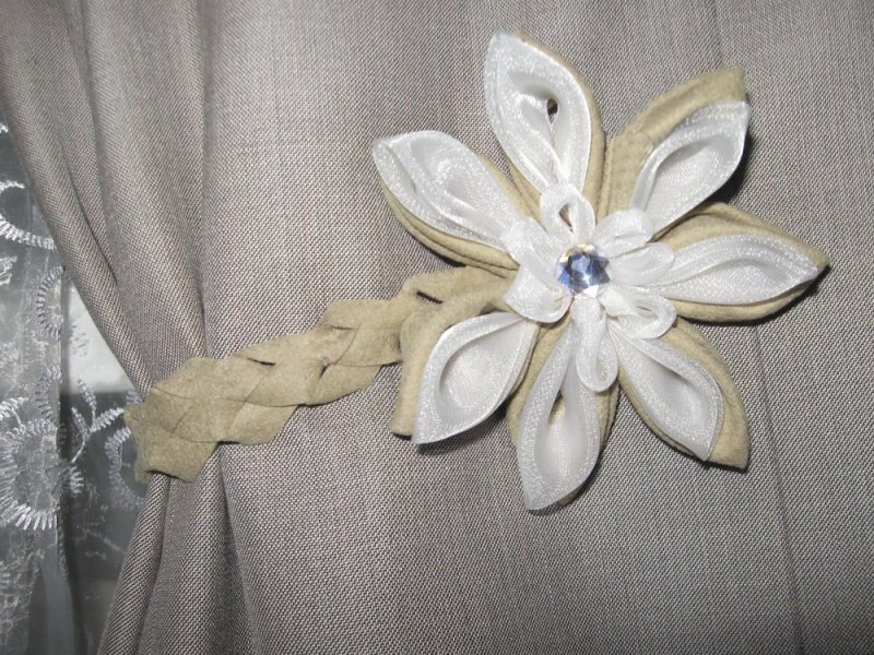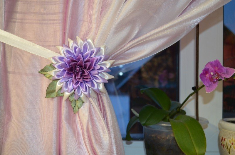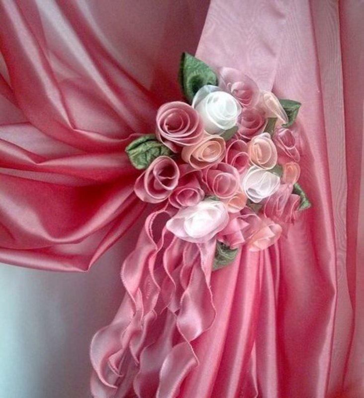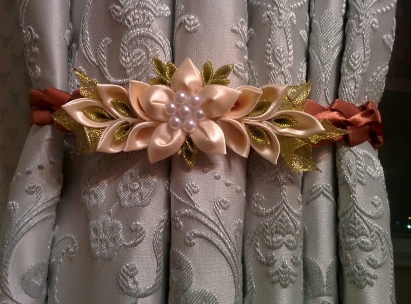 Занавески частично или полностью перекрывают солнечному свету доступ в помещение, делают комнатный декор завершенным. Чтобы оконное оформление выглядело благороднее, используются подхваты для штор. Такие элементы добавляют комнате индивидуальности, создавая красивую, гармоничную композицию. Многообразие держателей позволит подобрать оптимальный вариант под любой интерьер. Содержание Подхваты для штор – преимущества, недостатки различных материалов Металлические Фоамиран Атлас, вуаль, органза Кожа, экокожа Пластик Дерево Плетеные Виды Канзаши Магнитные Кисти-подхваты Ремни Декоративные Бижутерия Самодельные Шнуры Гибкие подхваты Клипсы Стиль, дизайн и цветовая гамма подхватов Способы крепления На какой высоте подхватывать Как сделать своими руками Заключение Подхваты для штор – преимущества, недостатки различных материалов Такой практичный аксессуар, как шторные подхваты, появился практически одновременно с первыми занавесками и до сих пор не вышел из моды. Для чего они нужны: крепления располагаются на любой удобной хозяевам высоте, позволяя зрительно откорректировать форму окна; чтобы свет с улицы частично проникал в комнату, шторы не открывают полностью, а присборивают, фиксируя по бокам проема; если ткань занавесок не слишком красивая, в собранном виде это менее заметно; окошки не требуется постоянно «расшторивать», потому гардины дольше остаются чистыми; при помощи подхватов, удерживающих занавесь определенным образом, легко преобразить интерьер за пару минут. Держатели выполняются из металла, цветной атласной ткани, фоамирана и кожи, пластмассы и органзы, реже – плетутся из лозы, шнурков, цветной проволоки, вытачиваются из натуральной древесины. Каждый вид имеет свои плюсы и минусы, подбирается под соответствующий интерьер. Металлические Изящные, блестящие либо матовые прихваты для штор обычно напоминают дверные ручки. Их крепят на стене, заправляя туда ткань. По форме это изделия как самые простые, тонкие, так и более замысловатые, украшенные коваными листьями, цветами, завитками, камушками, выполненные в виде руки, львиной лапы и др. Стоимость дизайнерского предмета обычно высокая, крепить его нужно максимально надежно, при помощи шурупов, саморезов. Различные по дизайну прихватки из металла украсят интерьеры лофта, индастриала, хай-тека, ампира. Фоамиран Фоамиран, также называемый ЭВА, пластичная замша, ревелюр, «фом» – это мягкий декоративный вспененный материал, используемый для рукоделия. Подхваты из него обычно украшаются вполне реалистичными цветами, целыми букетами, выполненными преимущественно в пастельных тонах. Подобное оформление отлично впишется в интерьеры классицизма, шебби-шика, барокко. Атлас, вуаль, органза Держатели, выполненные из тонкого текстиля, чаще всего идут в комплекте со шторами или заказываются одновременно с их пошивом. Одна из стандартных моделей держателя – двухсторонний «банан». Она имеет форму, широкую посредине, сужающуюся к краям, внутри – пластиковая деталь, красиво поддерживающая занавеску. При наличии петелек, блочек на краях держателя, его крепят к стене на крючок. Прочие тканевые варианты – мягкие, завязываются на узел, бантик. Замысловатые, яркие, блестящие аксессуары оптимально подойдут для гладких, однотонных занавесок. Многоцветные портьеры с 