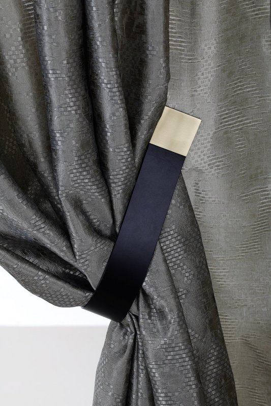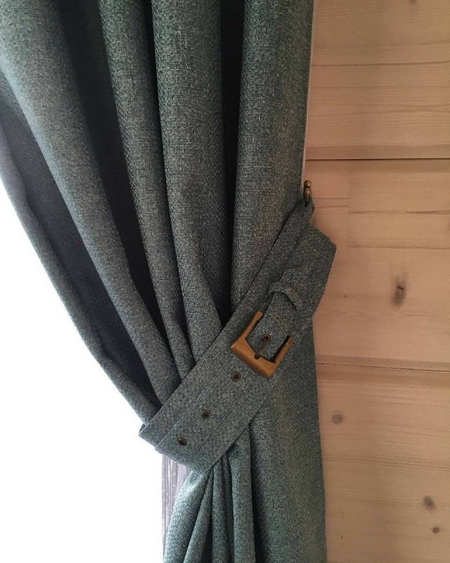 Ремень легко пошить из такой же ткани, как и сама штора, сделать в тон с другими аксессуарами. Наиболее брутально смотрятся ремешки, выполненные из кожи и оформленные заклепками. Застегиваются они также как обычный одежный предмет, иногда дополнительно закрепляясь на стене. Отлично подойдут для интерьеров лофт, минимализм, современный.
