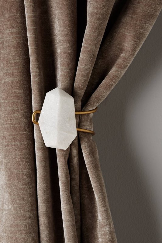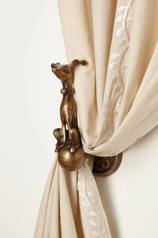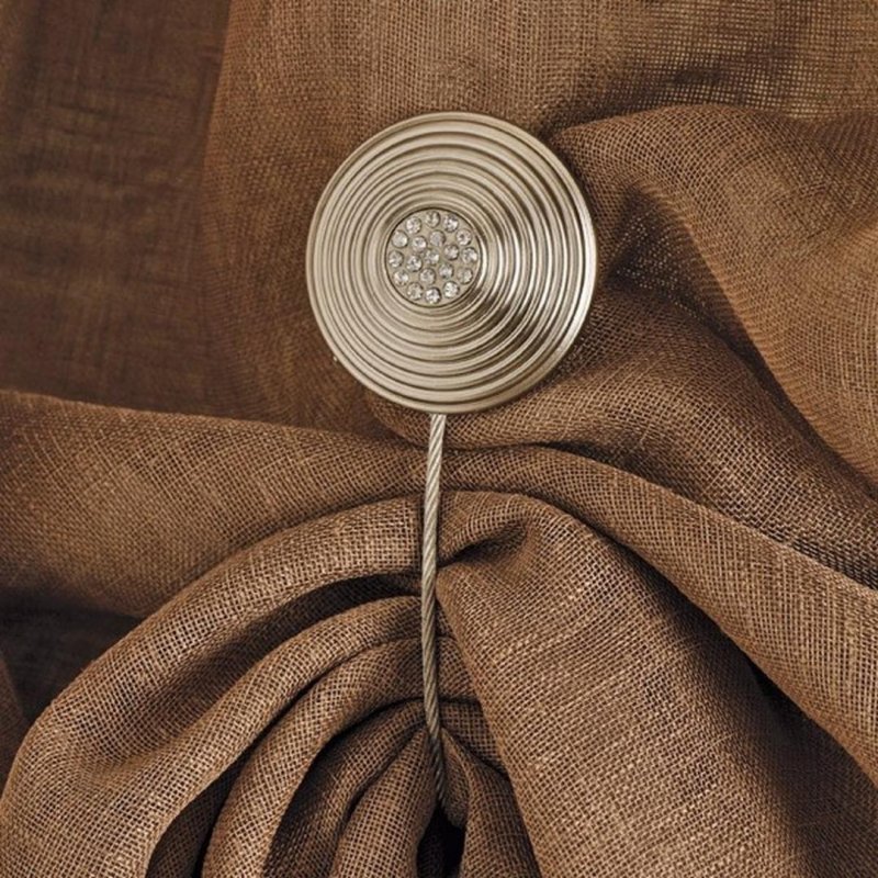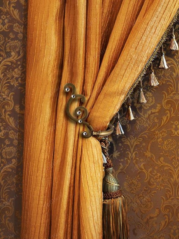 Изящные, блестящие либо матовые прихваты для штор обычно напоминают дверные ручки. Их крепят на стене, заправляя туда ткань. По форме это изделия как самые простые, тонкие, так и более замысловатые, украшенные коваными листьями, цветами, завитками, камушками, выполненные в виде руки, львиной лапы и др. Стоимость дизайнерского предмета обычно высокая, крепить его нужно максимально надежно, при помощи шурупов, саморезов. Различные по дизайну прихватки из металла украсят интерьеры лофта, индастриала, хай-тека, ампира.