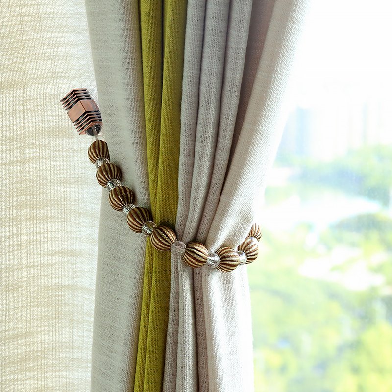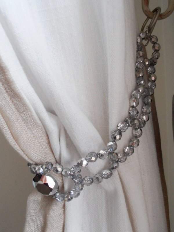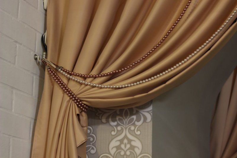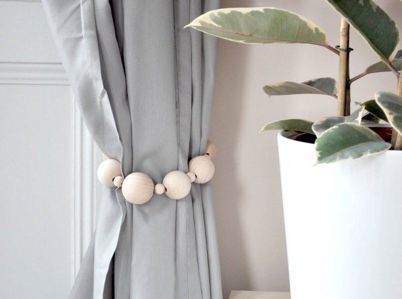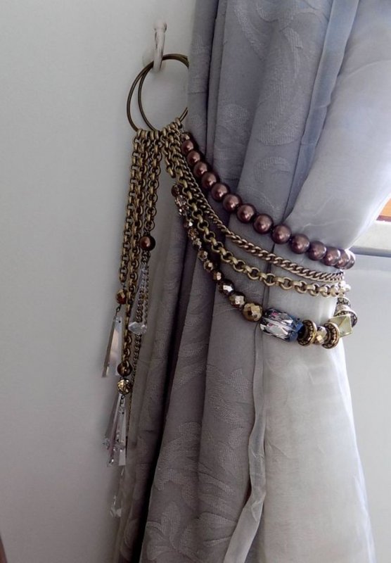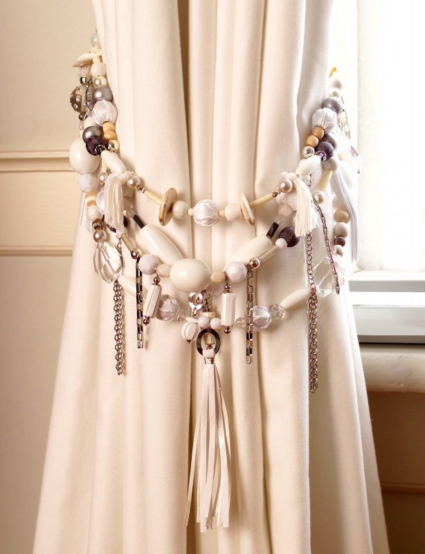 Держатели, напоминающие бусы – также отличная идея, для создания изысканной, «камерной» атмосферы. Для однотонных штор применяют пестрые изделия, для цветастых – однотонные варианты. Использовать допустимо как готовые предметы бижутерии на прочной нити, так и самодельные, выполненные из деревянных бусин, камушков с отверстиями, жемчужин, перфорированных пластиковых кубиков.