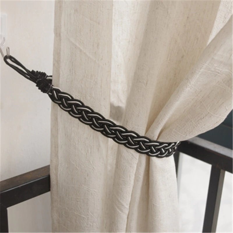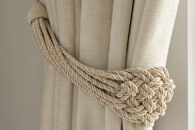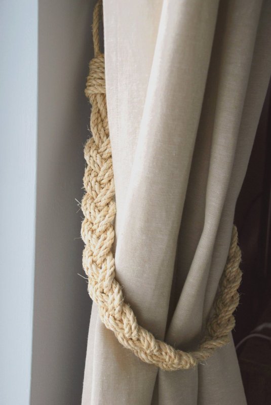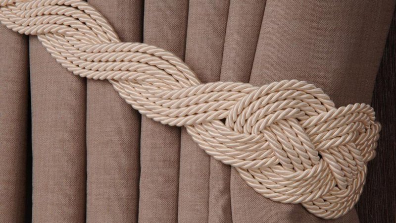 Шнур, продающийся практически во всех хозяйственных магазинах, точках продаж домашнего текстиля – самый простой вариант подхвата. К преимуществам относится широкое разнообразие толщины, цветовой гаммы. Изделие оптимально подойдет для интерьеров, оформленных в стиле минимализм, японский, скандинавский, кантри. Из шнурков плетут косички, разные узлы в технике макраме.