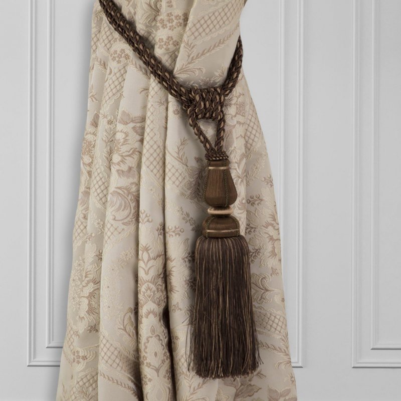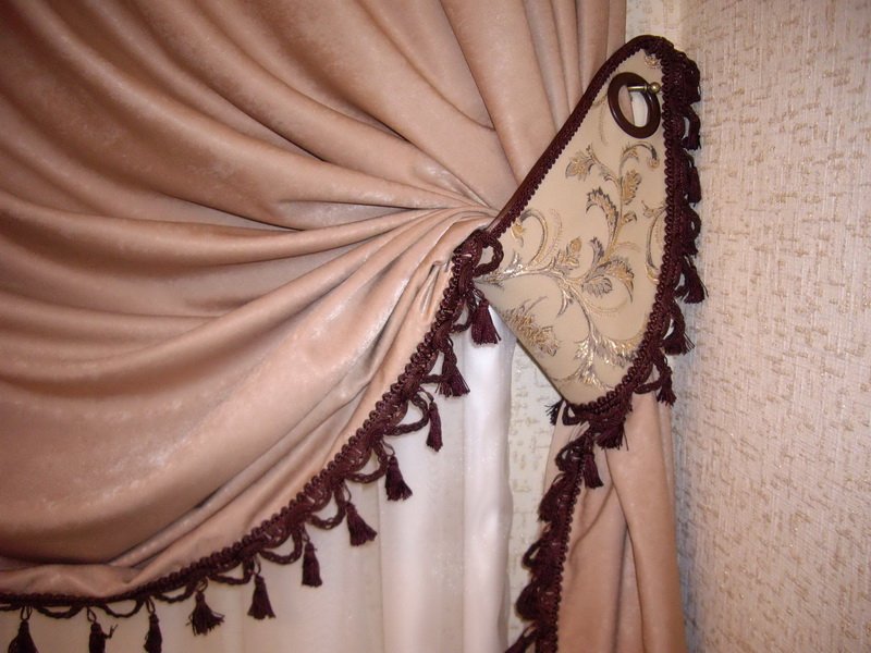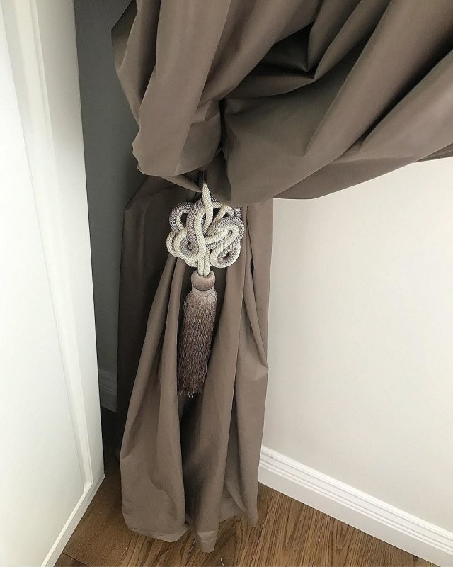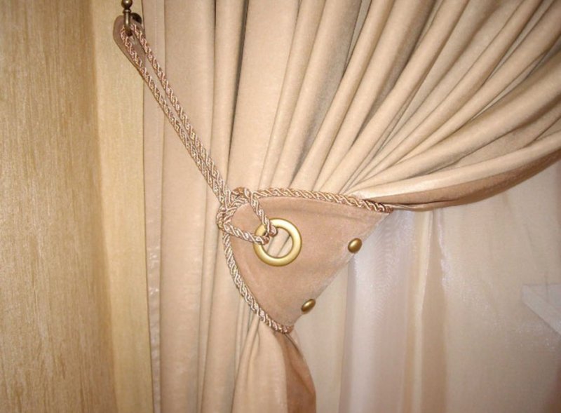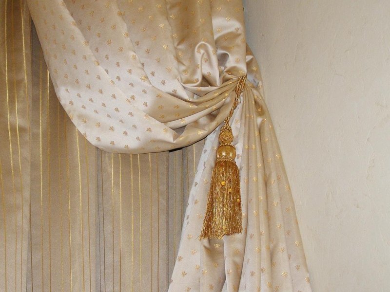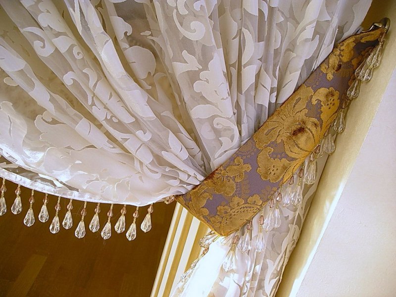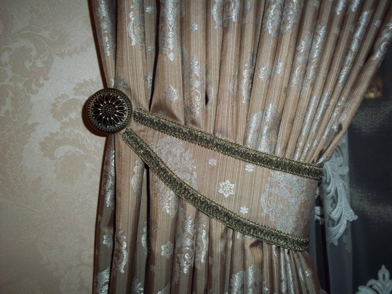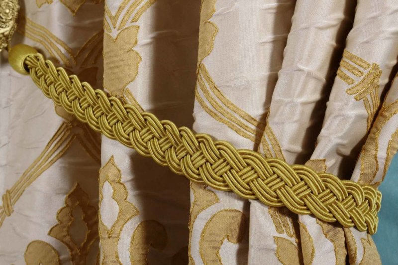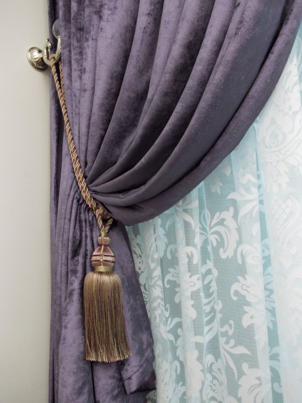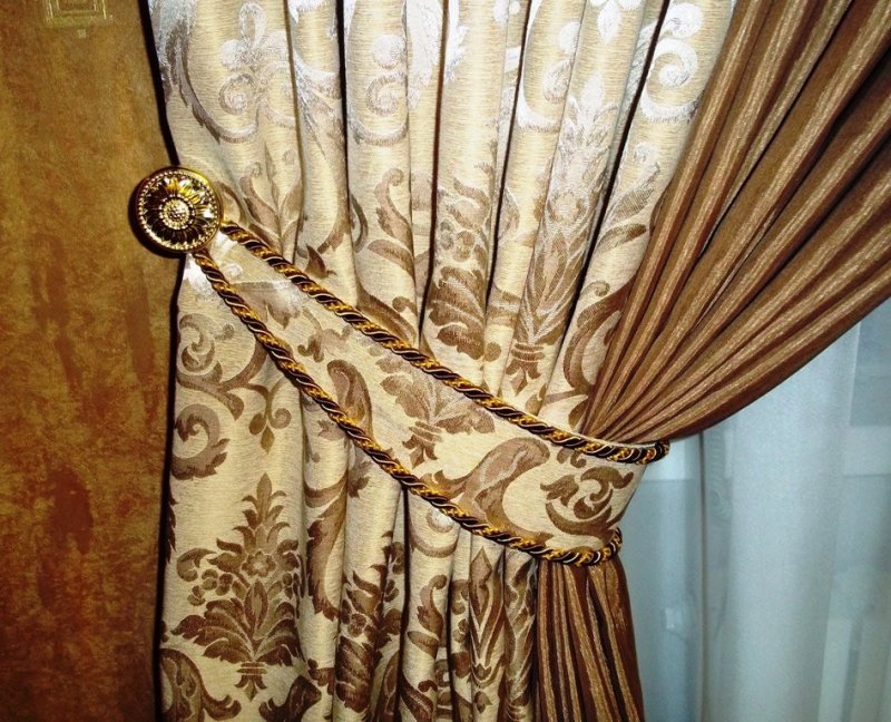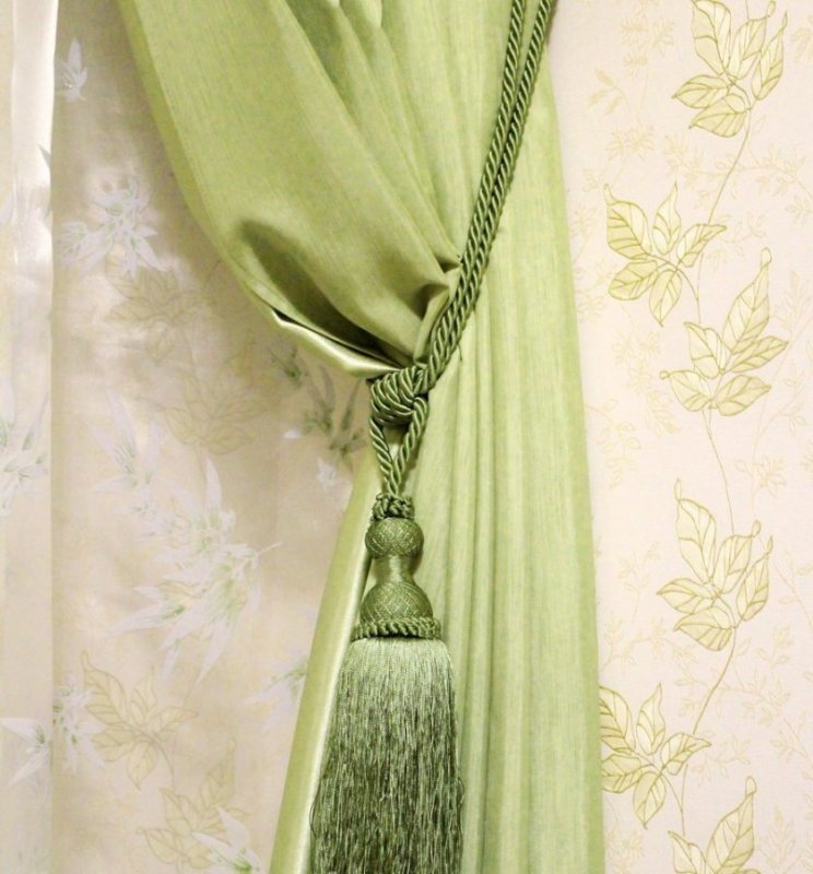 Подобные предметы всех форм и расцветок легко приобрести в ближайшем магазине текстиля или создать своими руками. В сочетании с тяжелыми, дорогостоящими тканями (парчой, велюром, бархатом, жаккардом, плотным шелком и др.), витые подхваты с кистями смотрятся весьма «статусно», оживляя монотонность портьер. Для создания красивой шторной драпировки занавеску просто перетягивают в нужном месте, слегка расправляют.
