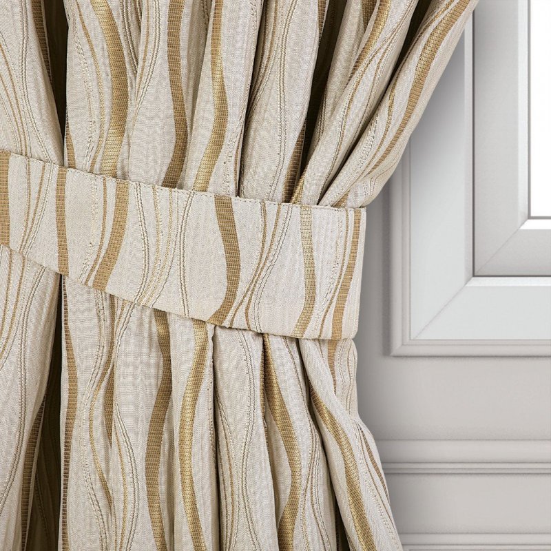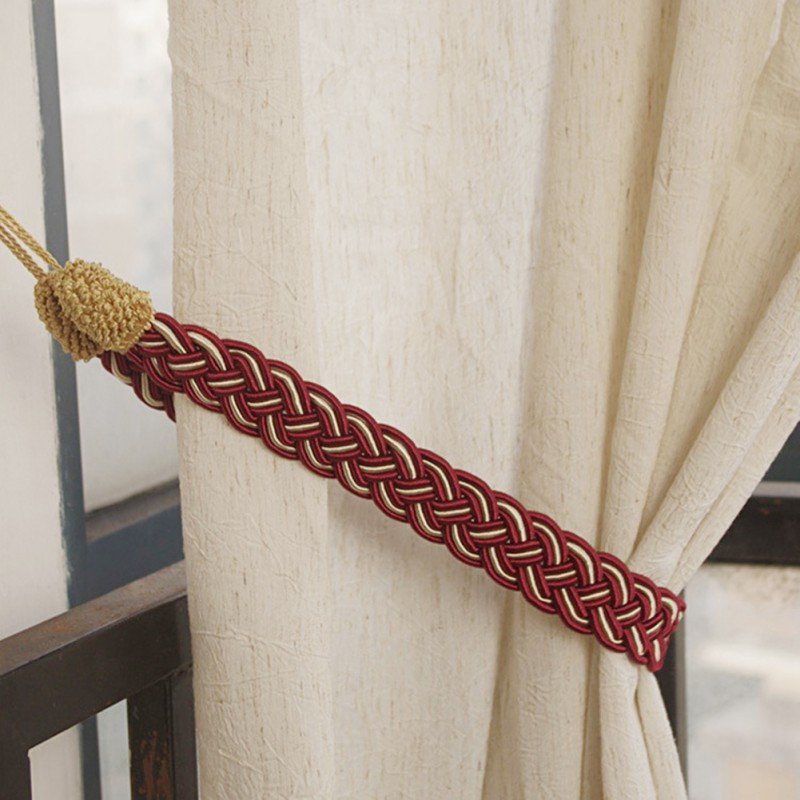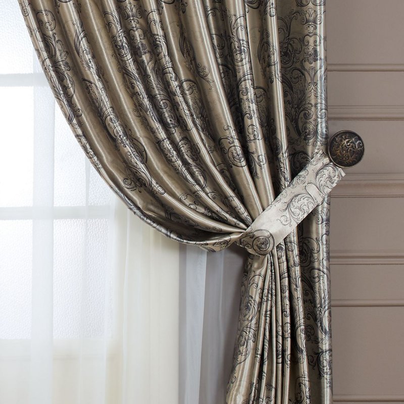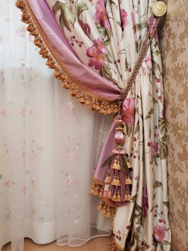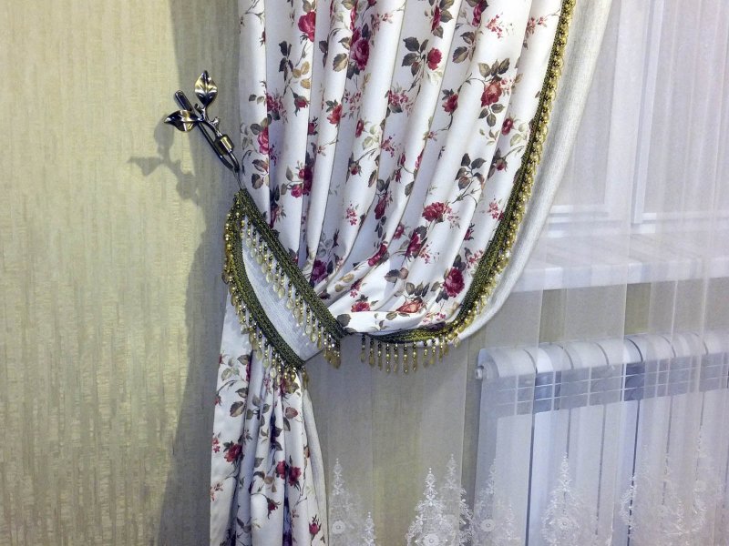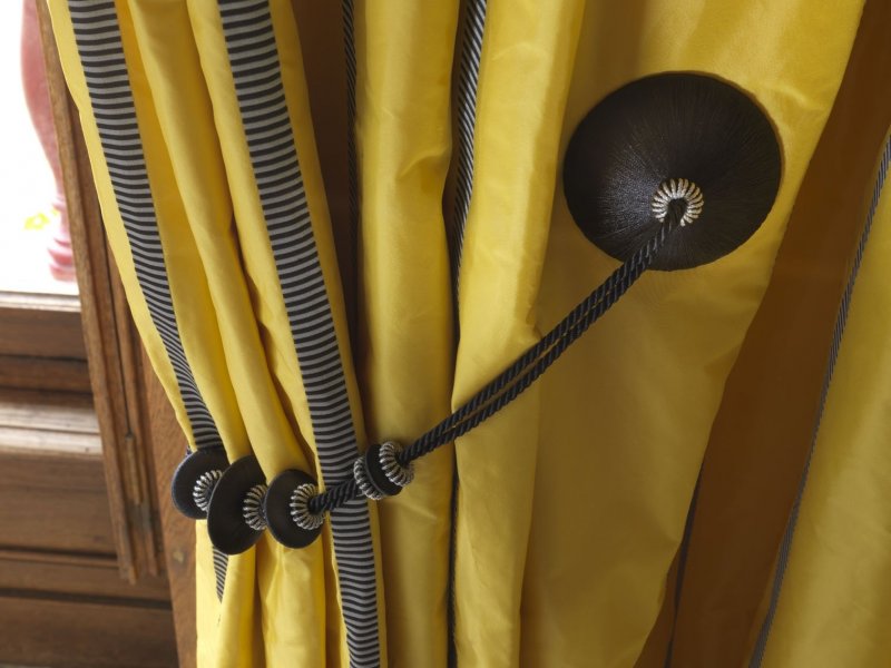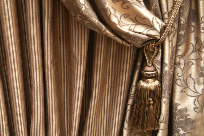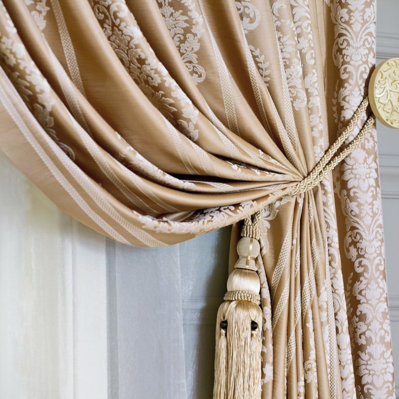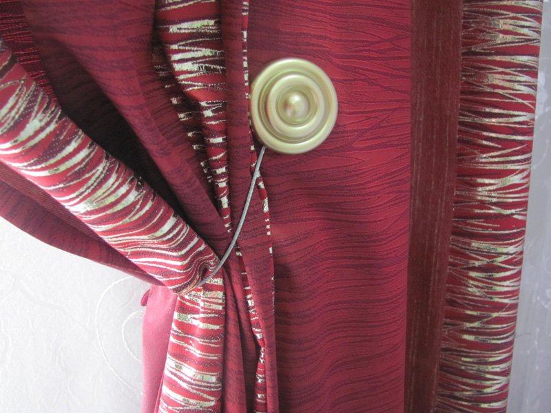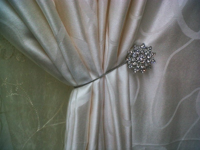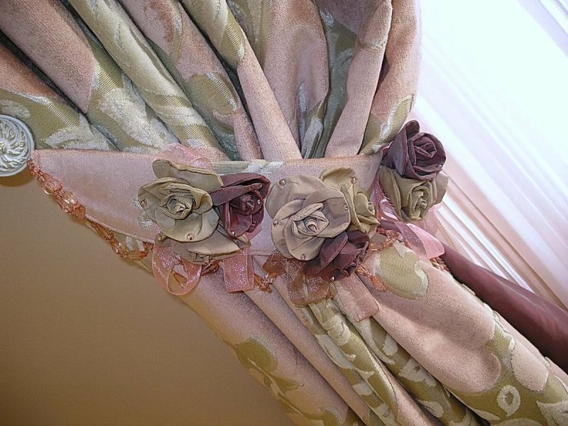 Подобные предметы всех форм и расцветок легко приобрести в ближайшем магазине текстиля или создать своими руками. В сочетании с тяжелыми, дорогостоящими тканями (парчой, велюром, бархатом, жаккардом, плотным шелком и др.), витые подхваты с кистями смотрятся весьма «статусно», оживляя монотонность портьер. Для создания красивой шторной драпировки занавеску просто перетягивают в нужном месте, слегка расправляют.