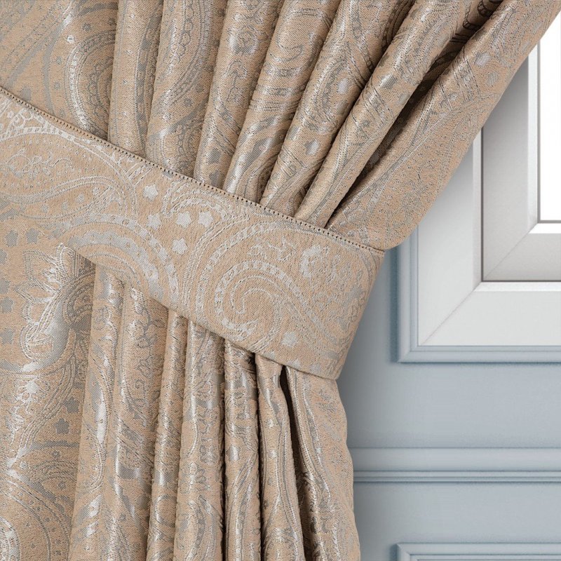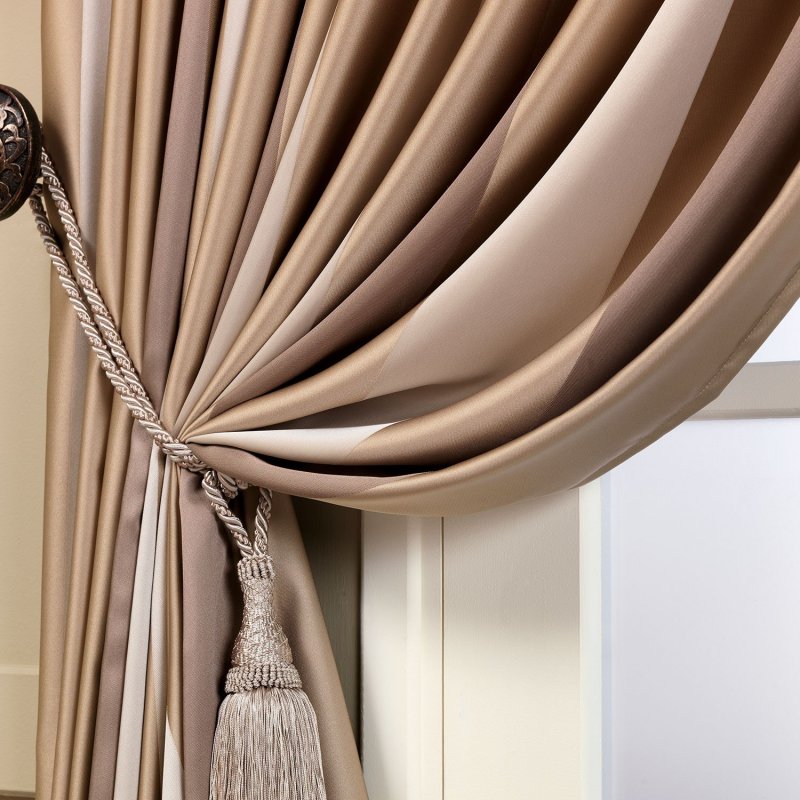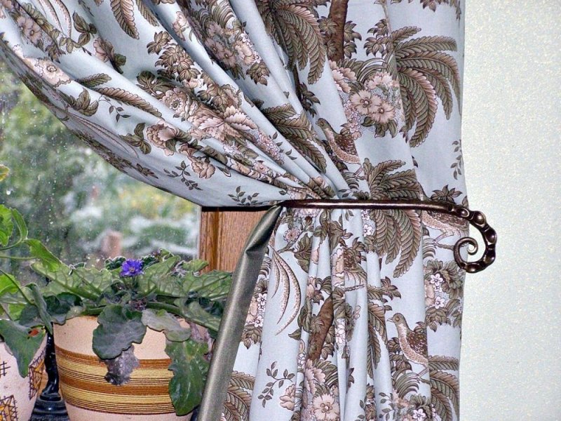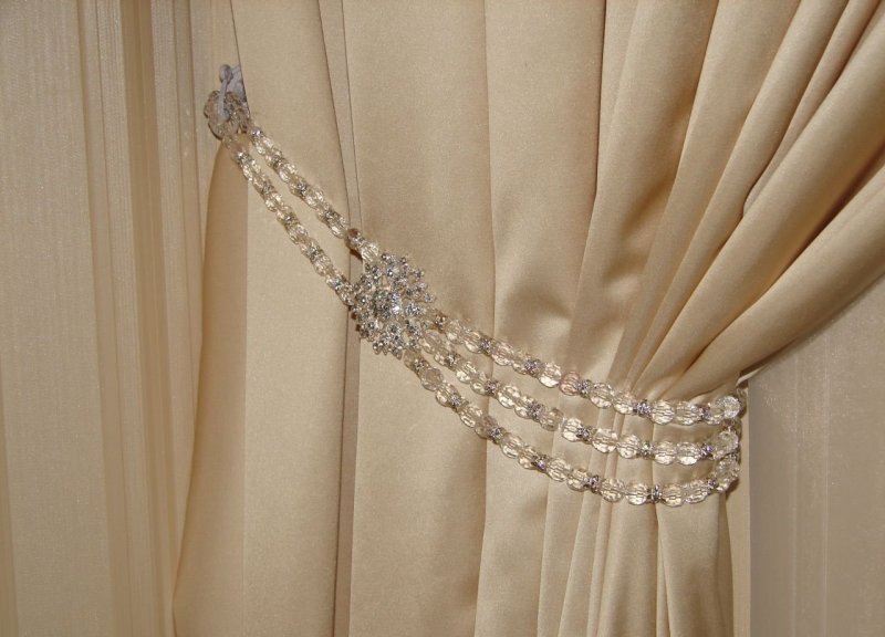 Замысловатые, яркие, блестящие аксессуары оптимально подойдут для гладких, однотонных занавесок. Многоцветные портьеры с замысловатыми узорами оформляются простыми подхватами в виде шнурков, узких текстильных отрезов.