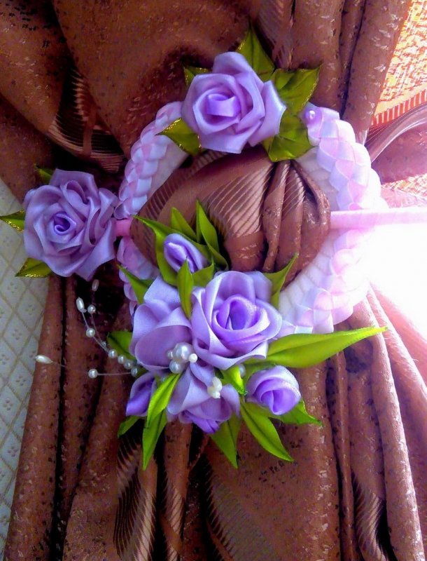 слегка согнутый ободок для волос также отлично удержит занавес. К концам изделия привязывают ленты, завязывая их на бант, декоративный узел.