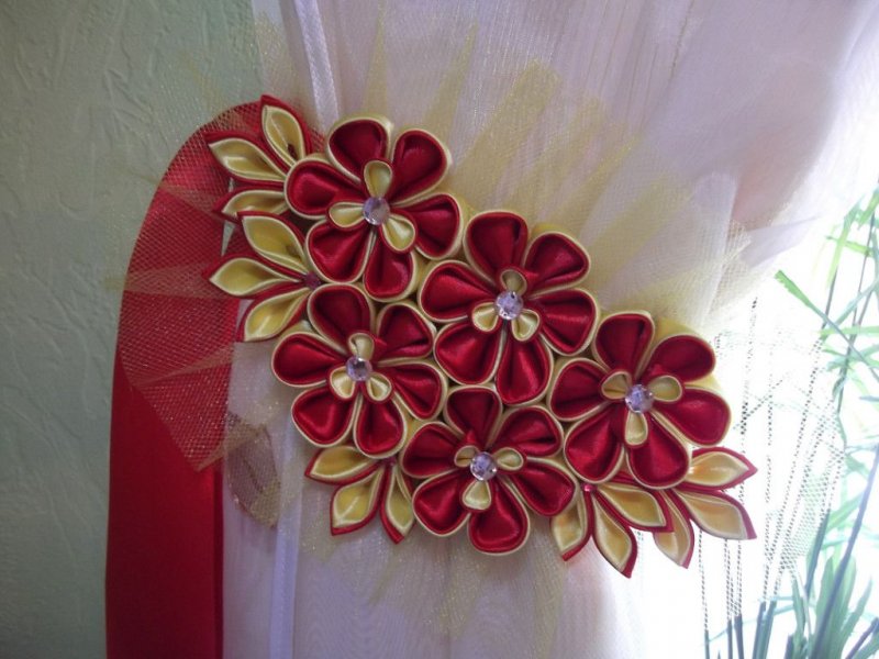 легкие, но праздничные интерьеры шебби-шик, иногда прованс, украшаются элементами в технике канзаши, выполненными из множества атласных ленточек. Фактурные канзаши-букеты или отдельные цветки обычно подбираются контрастирующими с самой шторой, но подходящими под другие предметы обстановки;