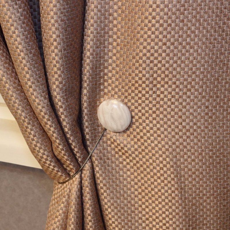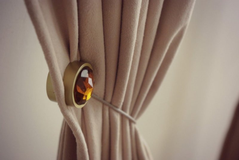 Шторные аксессуары на магнитах – лучший вариант закрепления легкой ткани. Магнитики здесь оформляются по-разному – полудрагоценные камушки разного колера, пластиковые «смайлики», ромбики, квадратики, цветочки, фигурки животных. Они крепятся на кончики широких лент, витых шнурков, обтягиваются тканью, украшаются стразами, бисером и др.