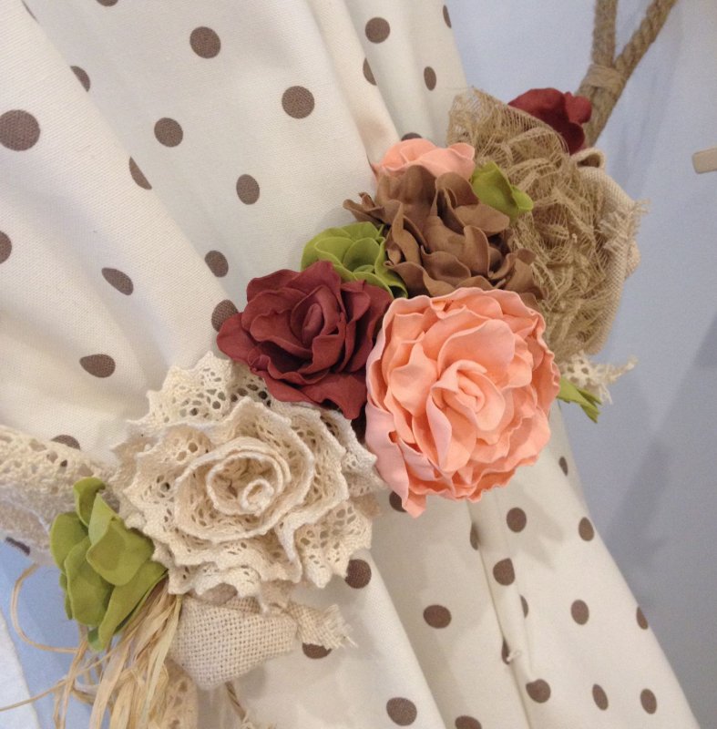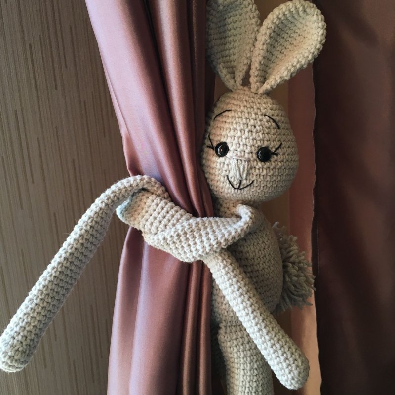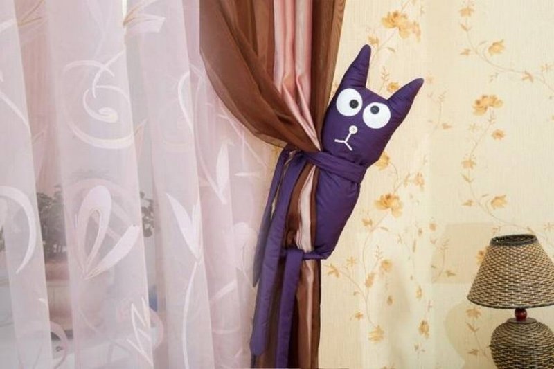 Оригинальные подхваты легко сделать из чашек без дна, ложек, мягких игрушек. Последний вариант наиболее часто используется для оформления комнаты ребенка, детского кафе. Такие элементы обычно представляют собой милых фетровых зверушек, балеринок, ангелочков, феечек, цветочки, обнимающие драпировку. В их лапки, ножки, ручки, хвостики, стебельки вставляется гибкая проволока, пришиваются пуговки, липучки, различные магнитные держатели. Игрушки с удлиненными туловищами, конечностями просто завязываются вокруг шторы на узел.
