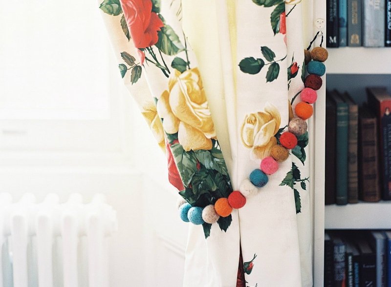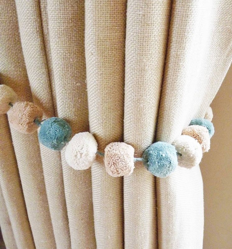 из помпонов – пряжа нарезается кусочками по четыре-семь см, каждые 20-30 отрезков перетягиваются посредине ниткой, распушиваются. 8-12 элементов нанизываются на прочную нить, закрепляются в нужном месте шторы;