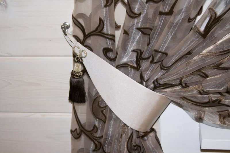 Гибкие фиксаторы закрепляются на самой занавеси либо цепляются к настенному держателю. Их шьют из ткани, приобретают в комплекте с занавесками. В основе – проволока, прочный полимерный материал. Декорируется изделие блестками, бусинами, цветами, кружевами, брошками, бахромой.