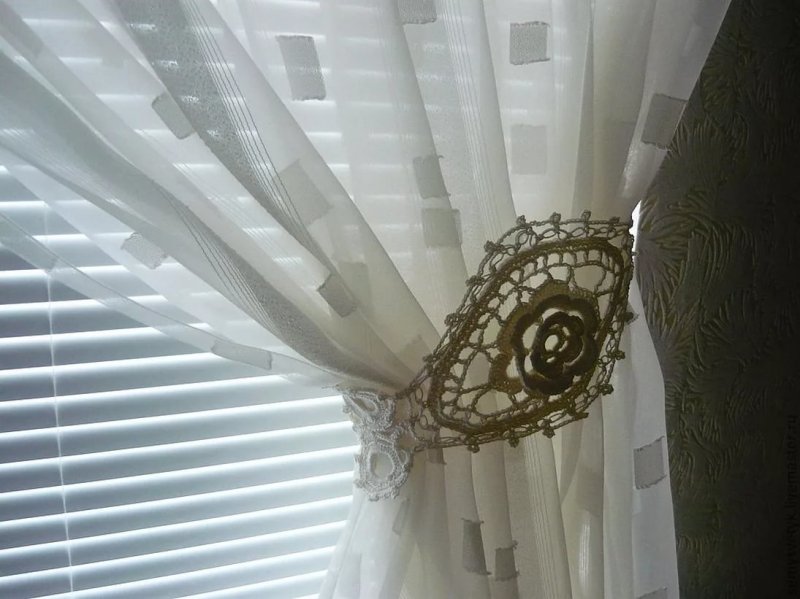Гардины с подхватами, выполненными в технике «узелкового плетения» макраме, смотрятся весьма самобытно, по-домашнему. Они легко удержат даже самую тяжелую драпировку, отлично впишутся в интерьер прованса, рустика, модерна. Такое изделие представляет собой плетенную из толстых ниток, шнурков, веревок косичку, цепочку с выпуклыми «горошинами», огромный плоский узел и др.