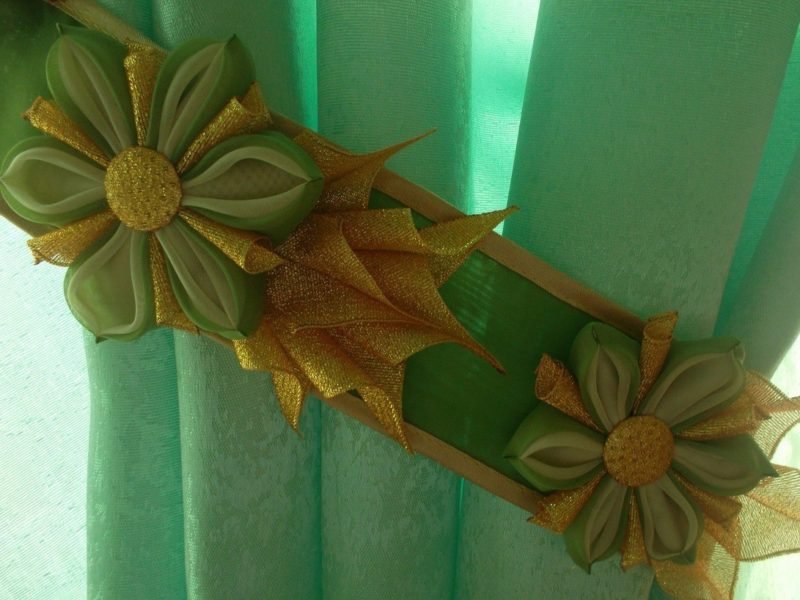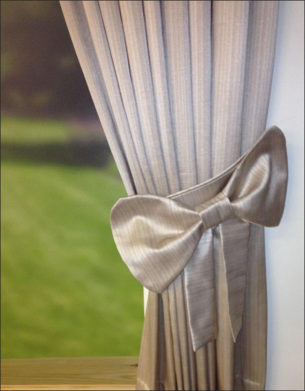 из ткани, оставшейся после пошива занавесок. Для одного держателя потребуется лента, шириной 8-12 см, которую складывают вдоль пополам, прострачивают по длинной стороне, выворачивают, завязывают на штору, украшают бантами, пуговицами, пластмассовыми бабочками;