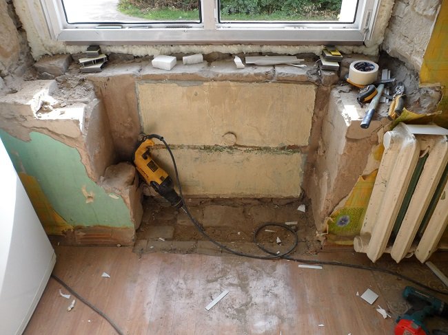 В третьем случае демонтируем подоконник. Все очищаем. Заменяем испорченные кирпичи на новые. Применяем штукатурку и глубокую грунтовку для высокой адгезии и укрепления существующей отделки. Затем делаем гипсокартонную обшивку.