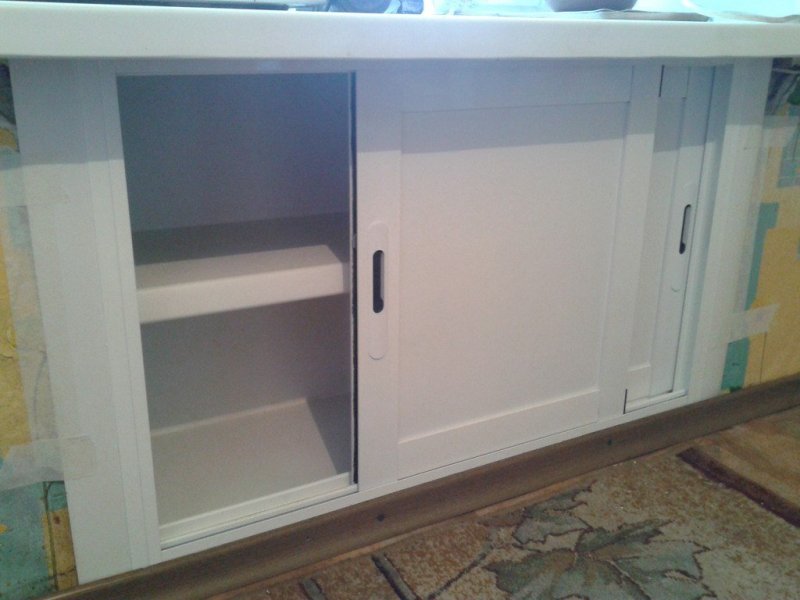 После этого встраиваем почти готовую конструкцию и приступаем к установке дверец. Отмечаем место для монтажа направляющей. С помощью крепежей устанавливаем дверцы.