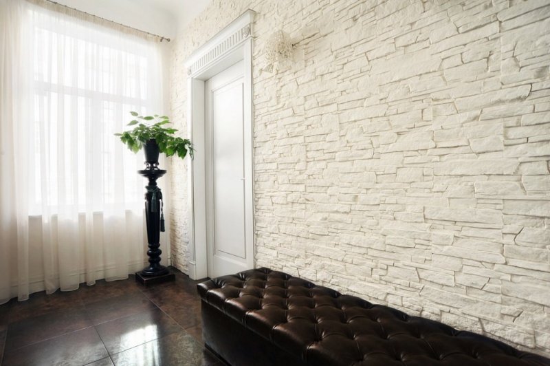 В прихожей гипсовыми кирпичиками облицовывают участок стен возле двери, углы. Материал наносят частично, имитируя обнажившийся камень. Чаще всего фрагменты выкладывают лесенкой, либо хаотично, располагая их в горизонтальной позиции. Для обрамления входа изделия укладывают перпендикулярно дверному проему. При отделке нижних участков соседних стен выполняют кладку по принципу кирпичной.