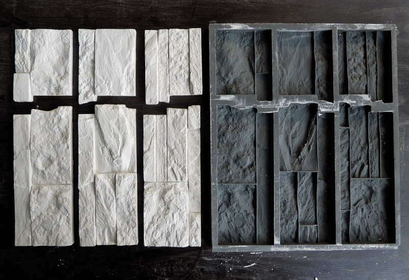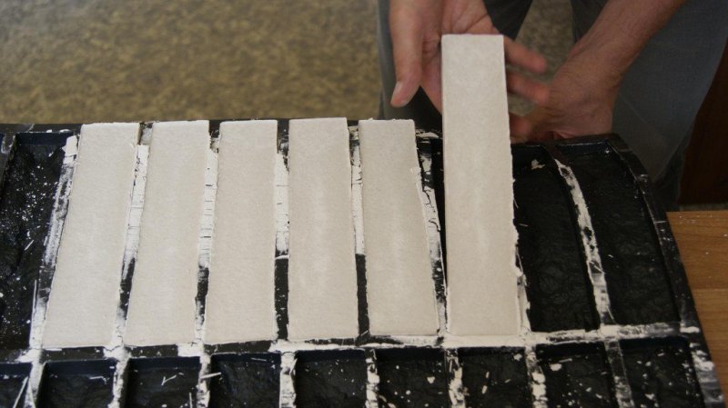 Работа займет несколько дней. Для формирования будущей емкости потребуется образец плитки. В готовую матрицу заливаем жидкий полиуретан с отвердителем и ждем до полного застывания. Для производства кирпича достаточно глубины формы 0,5-1 см, а для имитации сланца – 1-2,5 см.