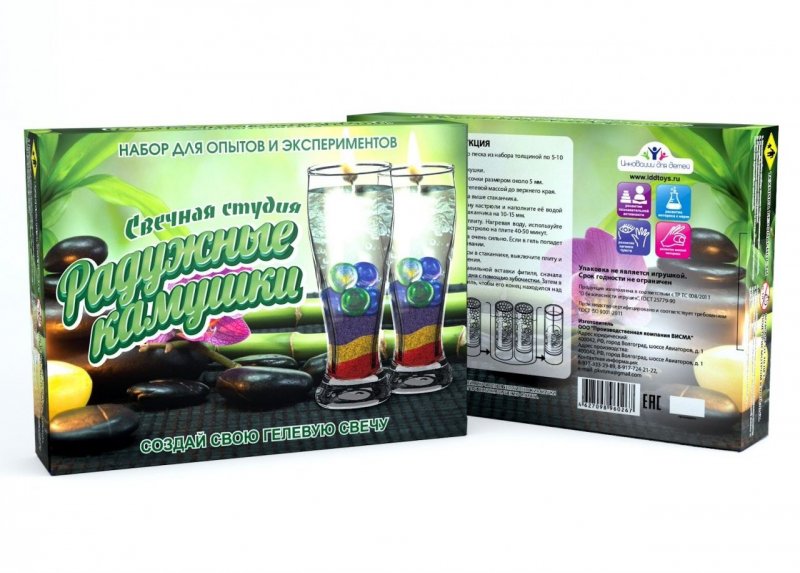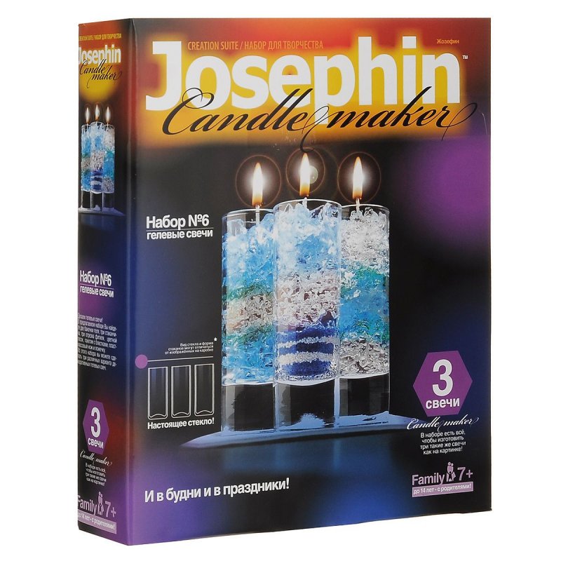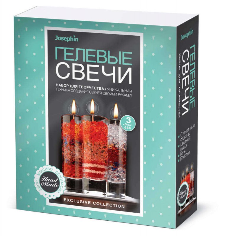 Josephin предлагает набор «Гелевые свечи». В качестве материала использован гель, который нужно расплавить. Для декорирования предусмотрен цветной песок, ракушки, блестки.