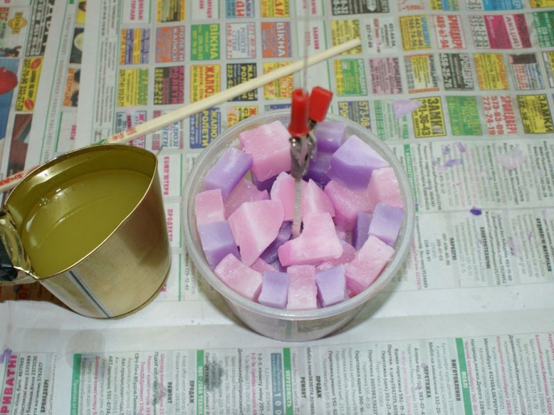 Окрасить свечную массу очень легко. Нужно добавить к расплавленному материалу кусочки специальных красителей для свечей. В продаже они представлены огромным разнообразием оттенков.