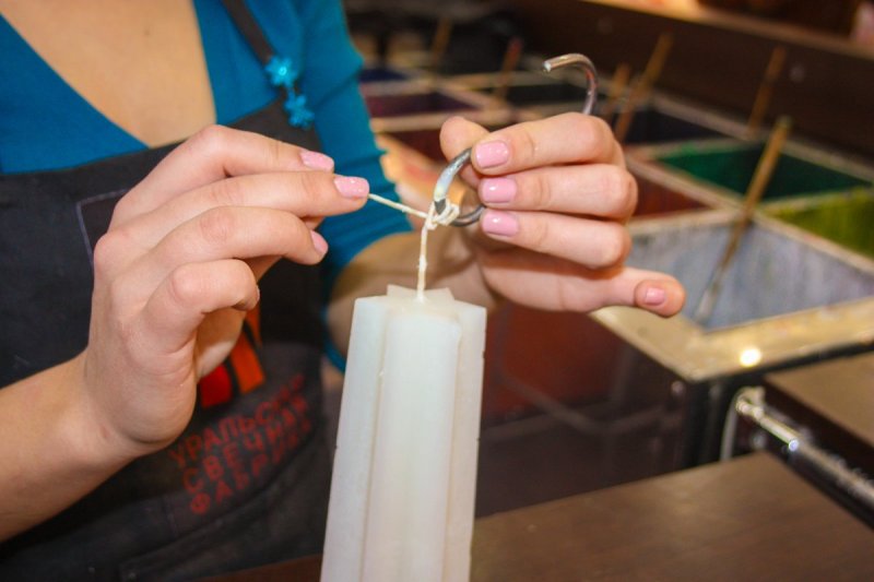 Свечи из воска производят путем многократного опускания фитиля в растопленный материал. Если добавить его к «компании» парафина и стеарина, можно получить очень красивые долго горящие изделия.