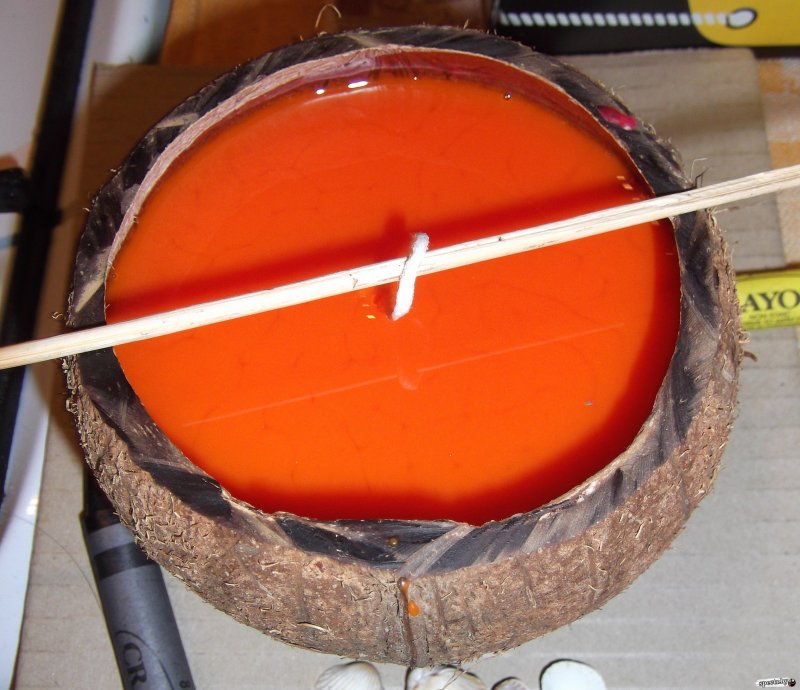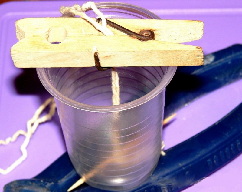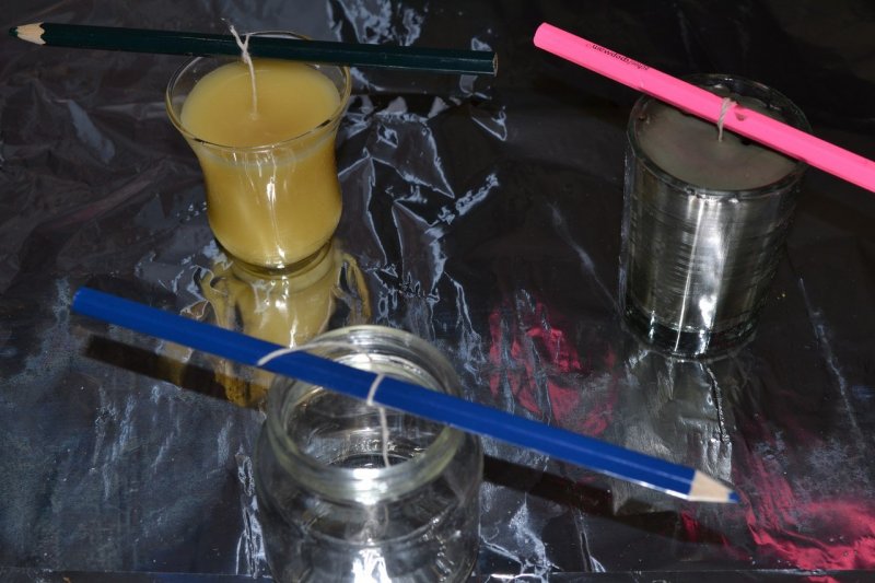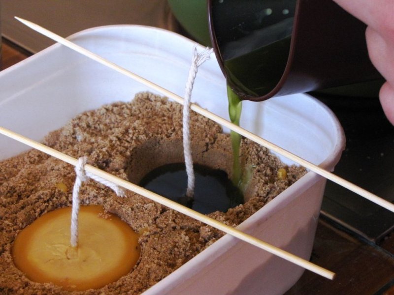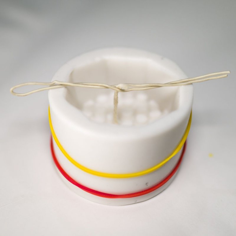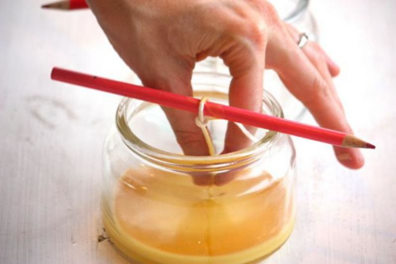 Прежде чем переливать расплавленную свечную массу в форму, нужно погрузить в смесь кончик фитиля. Так он будет лучше гореть. Для того чтобы укрепить его в форме, пропустите его сквозь отверстие в дне и зафиксируйте скотчем. Если подобного отверстия нет, используют металлический держатель круглой формы или прилепляют ко дну на каплю воска. Свободный конец шнура наматывают на карандаш и натягивают его таким образом, чтобы фитиль расположился в центре свечи. После застывания необходимо отрезать лишнюю часть шнура – при горении слишком длинный образец будет коптить.