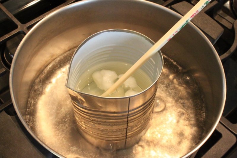Для ускорения процесса измельчите материал с помощью ножа или терки. Наполните кастрюлю поменьше воском и поместите в большую емкость с водой. В качестве маленькой посуды можно использовать емкости из термостойкого стекла, кастрюли из нержавейки, эмалированные или алюминиевые. Не используйте изделия из чугуна или меди, так как они портят цвет воска. Очистить посуду от воска невероятно сложно, поэтому забудьте о том, чтобы использовать ее для приготовления пищи.