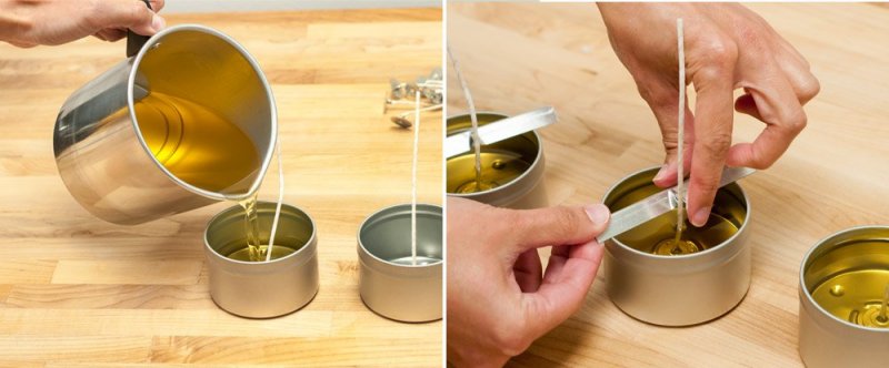 Если после застывания вокруг фитиля образовалось пустое пространство, разогрейте небольшое количество смеси на водяной бане и заполните ямку.