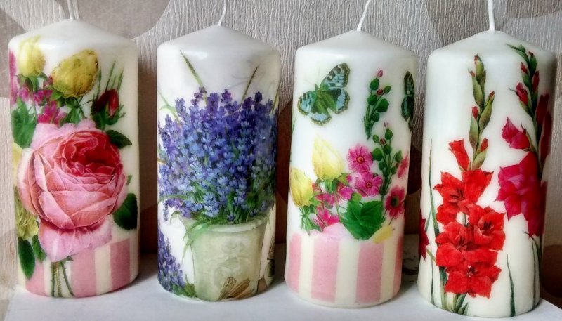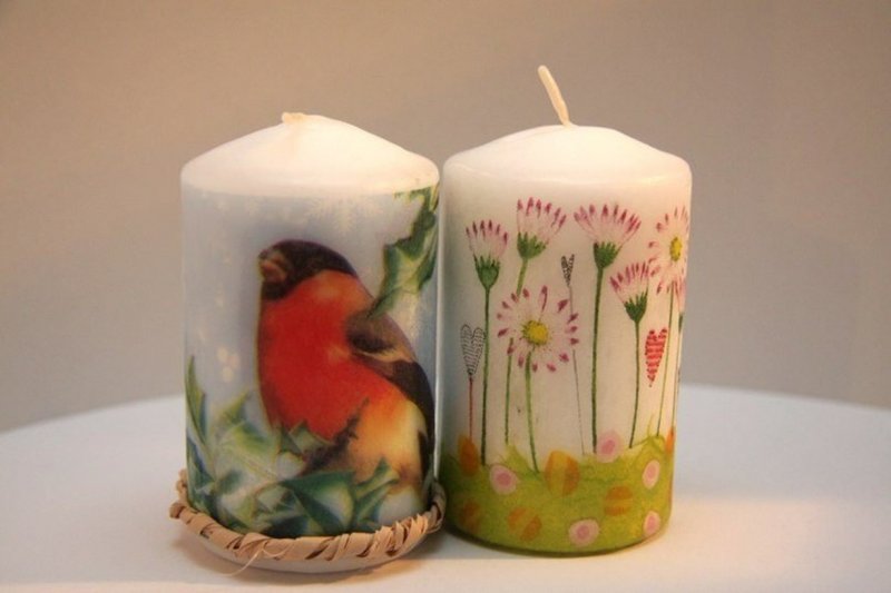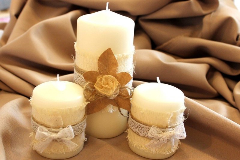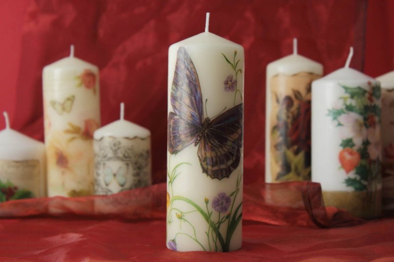 Для декорирования свечей используют самые разные материалы – ткань, кружево, мешковину, атласные ленты, лепестки цветов. Отлично смотрятся резные свечки. Можно использовать технику декупаж – есть подходящие салфетки под любой праздник. Интересная идея – обернуть свечу семейной фотографией или вашим изображением с избранником.