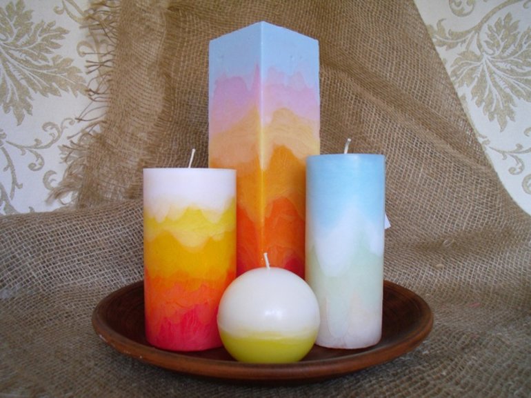 Для того чтобы окрасить парафин, положите в емкость для перетопки кусочки восковых мелков или специальный краситель. Можно заливать парафин разных цветов слоями или сочетать разные карандаши и получать яркие радужные разводы.