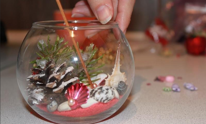 Если заполнить емкость декором еще до заливки геля, элементы распределятся по дну свечи. Другой способ – добавлять украшения в уже заполненную форму, чтобы они зависли или остались на поверхности. Так вы сможете распределить декор по всей площади согласно вашей задумке. Чтобы созданную внутри свечи композицию было хорошо видно, следует выбирать прозрачные формы. Гель можно сделать цветным и ароматным.