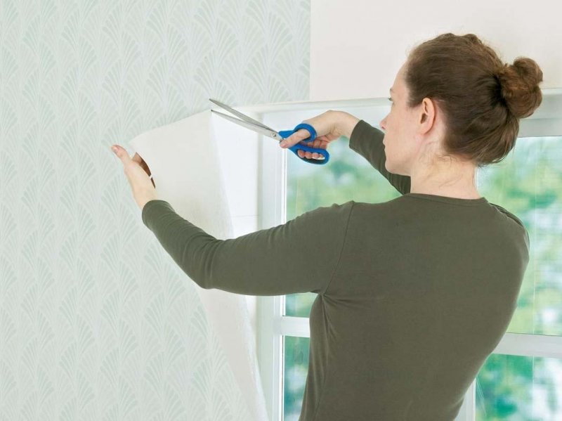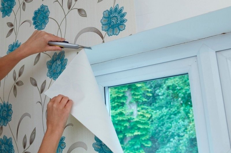 Для приклеивания полос над оконным проемом необходимо тщательно вымерить отрезы. Лучше, всего если вертикальная полоса сверху будет заходить на это пространство. Для этого нужно вырезать в ней угол. Этот вариант позволяет аккуратно обогнуть окно.