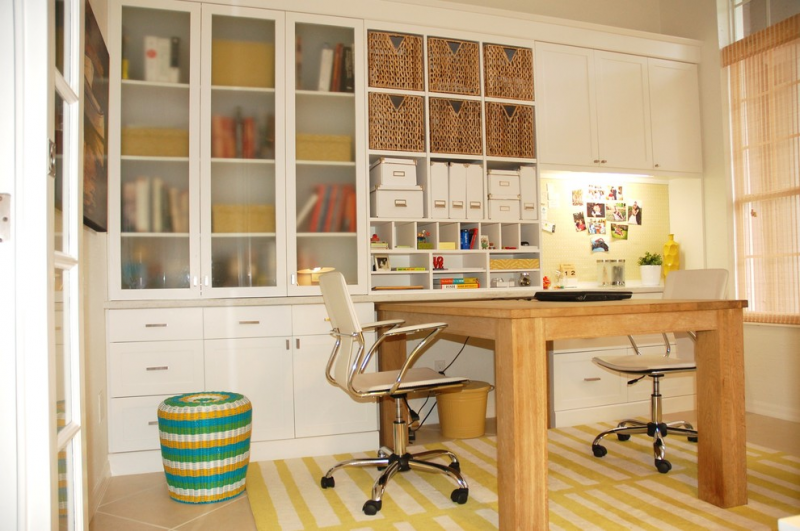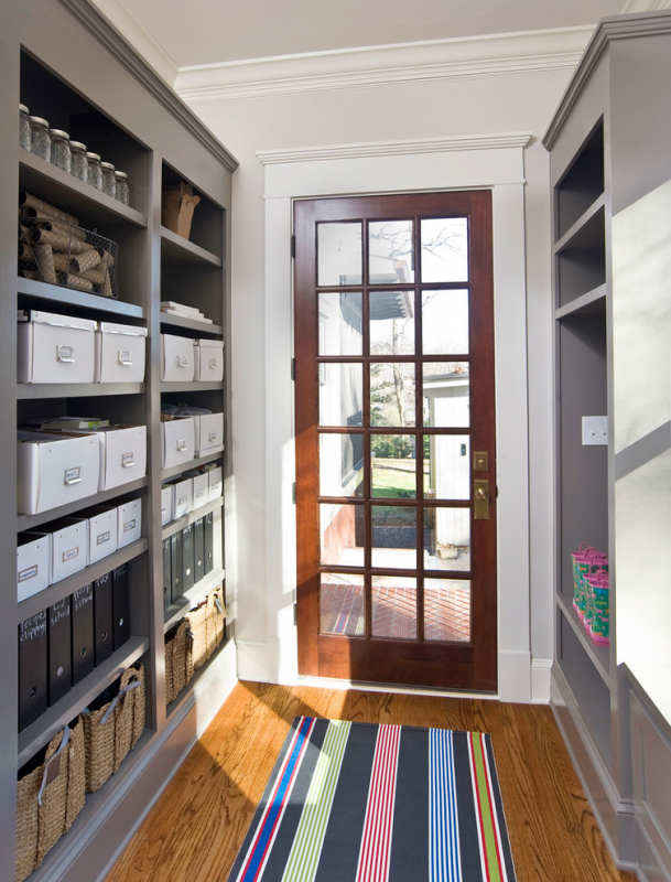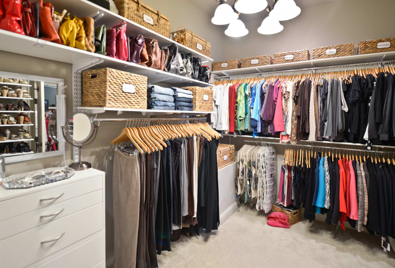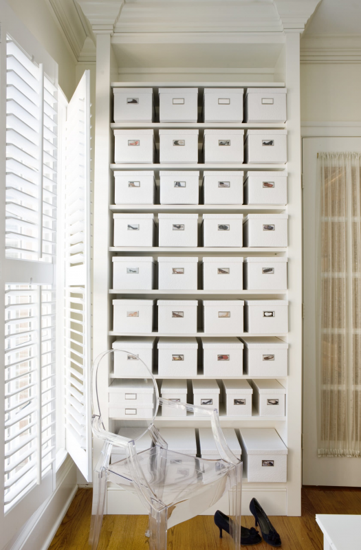 В спальне и гостиной рекомендуется помещать лотки для вещей, выполненные из картона, ротанга, дерева или пластика. Контейнеры классической формы разных размеров отлично сочетаются с самой разной цветовой гаммой помещения, а также подчеркивают домашний уют. Их можно поместить на стеллажах, под кроватью, а также в самом шкафу на полках. Нижнее белье, носки, колготки, аксессуары можно поместить в картонные коробочки с ячейками. Обувь удобно хранить в пластиковых контейнерах, а постельные принадлежности – в деревянных ящиках под кроватью.