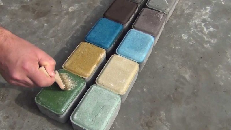 Как исходные красящие элементы, применяют сульфиды, сажу, соли и оксиды хрома, железа, титана. Кроме того, используют порошки цинка, никеля, алюминия, меди, а также ее сплавов. Декоративность в плане оттенка и текстуры придают именно пигментами в растворе. Подобного результата добиваются также кислотным травлением. Например, эффектов мрамора, диабаза, гранита, змеевика или состаренного вида. Красители для бетона и конкретно тротуарной плитки бывают природными, металлическими и синтетическими. Природные добывают из минералов и горных пород в результате измельчения, термообработки и обогащения. Синтетическими называют сложные соединения, полученные в результате технологических и химических процессов с высокой точностью подсчетов. Для наружного окрашивания выбирают алкидные, полиуретановые, эпоксидные, акриловые и резиновые краски.