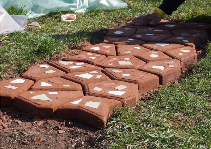 На простых дачах можно заметить плиточные фрагменты с большими расстояниями друг между другом, заполненными композитным материалом. Изготовить плитку для такого применения не составит труда, ведь подойдут любые формочки.