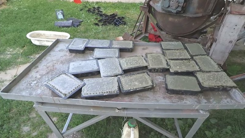 Понадобится, во-первых, бетономешалка. Хватит маленького варианта, причем оборудование можно одолжить или арендовать. Объем резервуара должен вмещать и перемешивать все ингредиенты смеси так, чтобы не образовывались даже малейшие комки. Состав потом уплотняют в форме, и в качестве оборудования выбирают вибростол. Показатели плитки по прочности, влагостойкости и атмосферостойкости в ходе обработки вырастут на 30 %. Стол придется делать самостоятельно, потому что его стоимость окажется неоправданно высокой. Придется купить формы для плитки, найти ведра и тазики. Формочки лучше покупать пластиковые или силиконовые. Самодельные из пиломатериалов тоже подойдут. Для удобства предметы следует складывать на стеллажах. Не обойтись также без мерных емкостей для дозировки пигментов и пластификатора. Вдобавок потребуются кухонные весы.