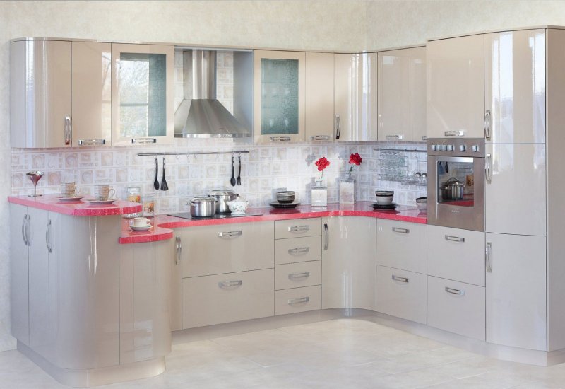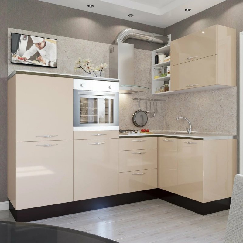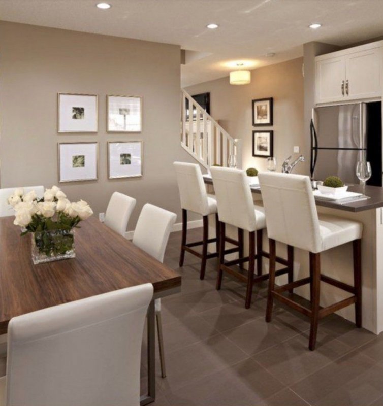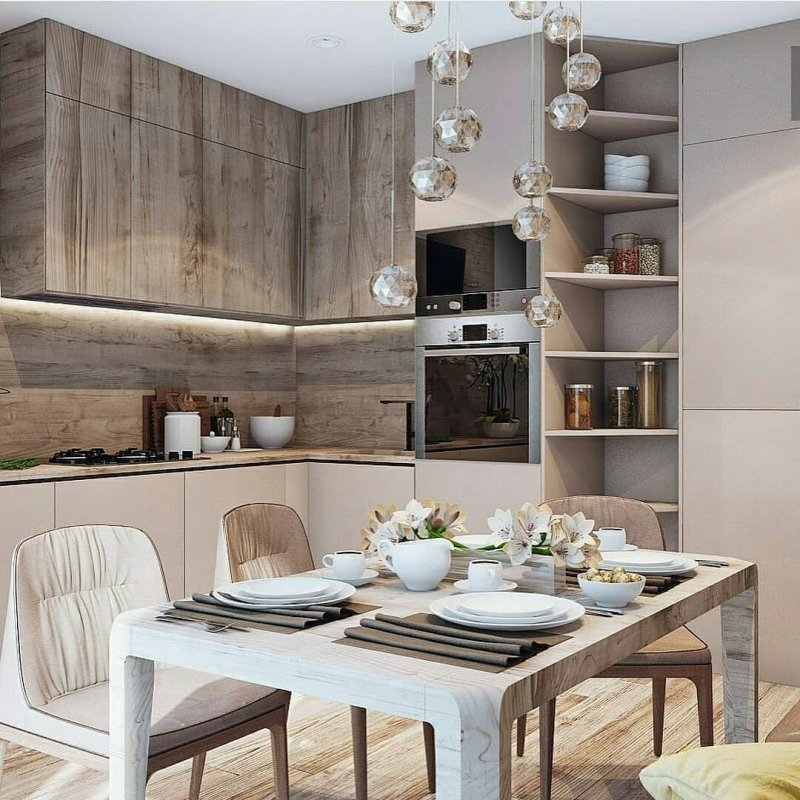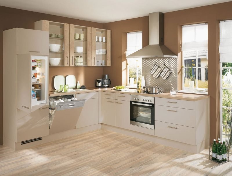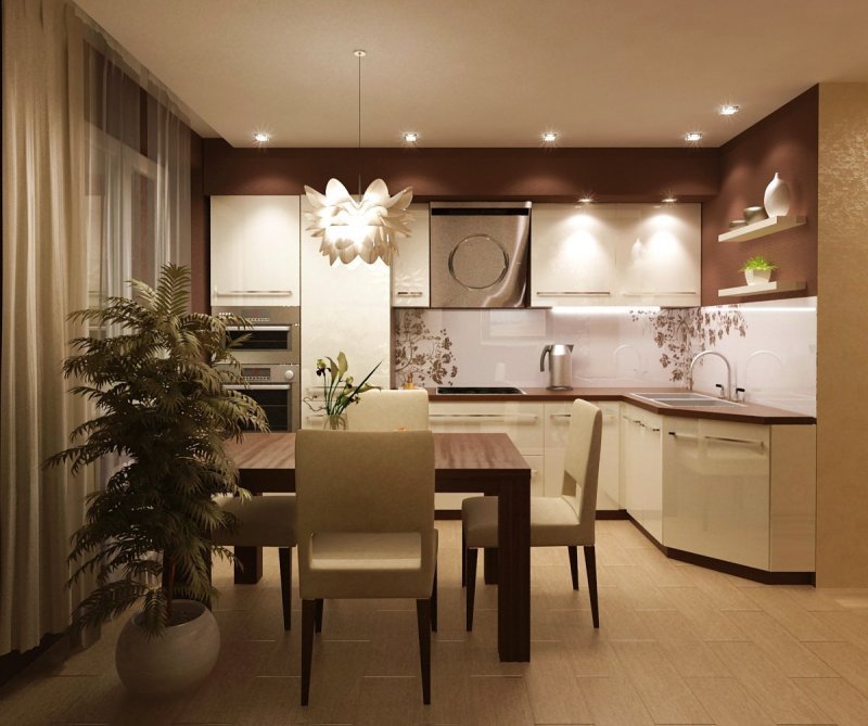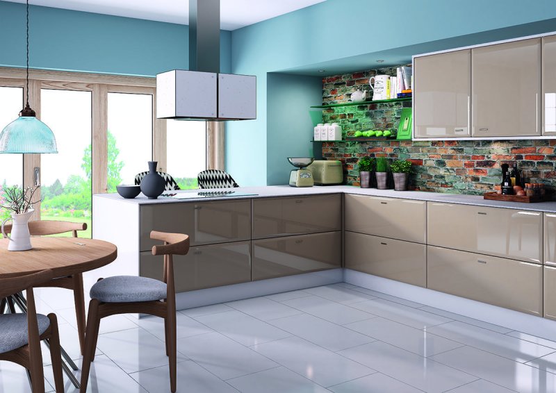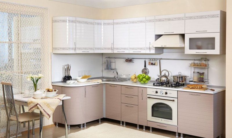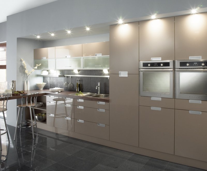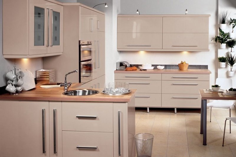 К белым стенам и потолкам кухонь как нельзя кстати подходит мебель цвета капучино — пусть он и выглядит не так технологично, как зеленый, синий и фиолетовый тона. Мягкость светло-коричневой гаммы улучшает аппетит, а это полезно во время принятия пищи и ее приготовления.