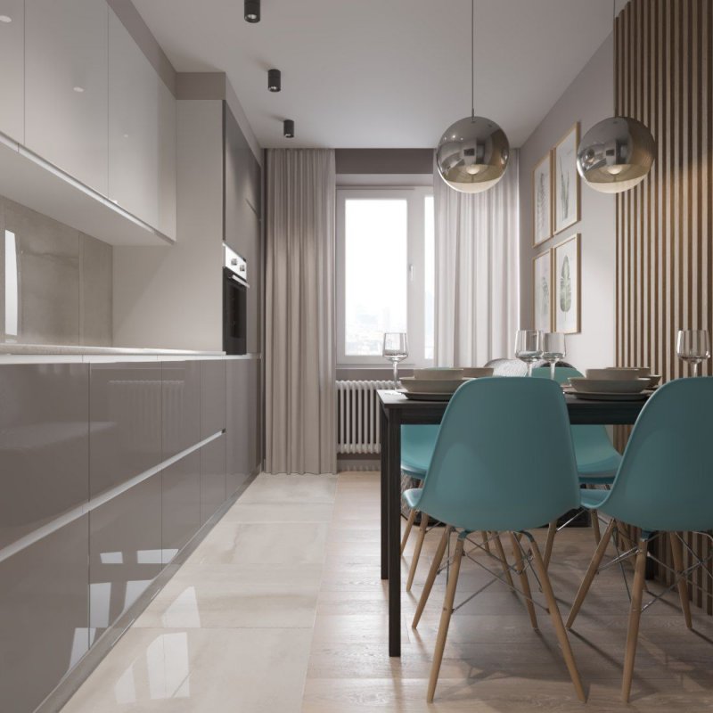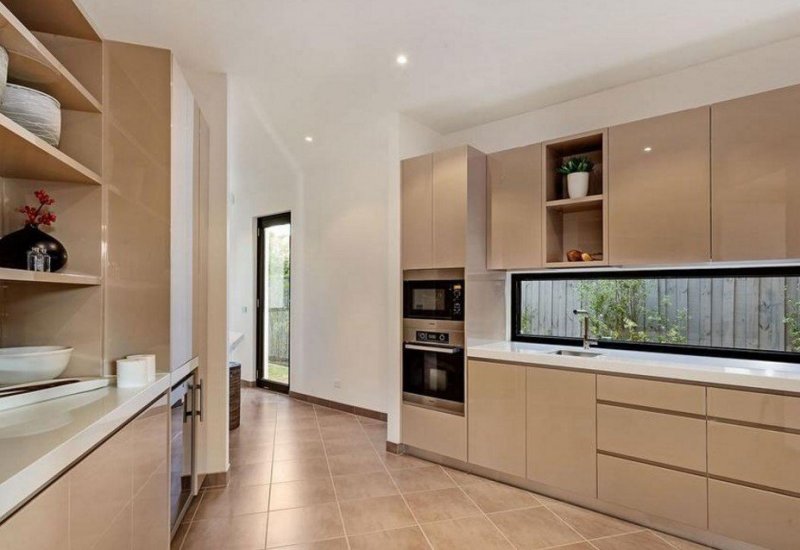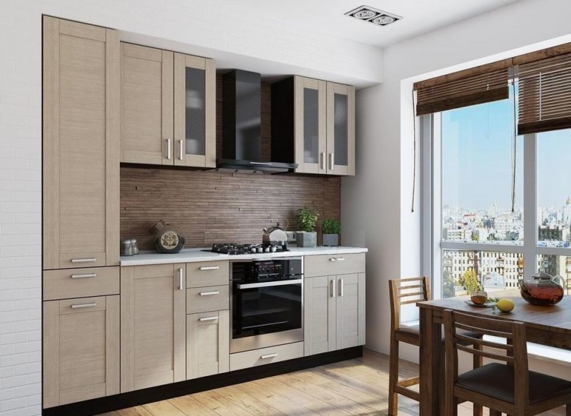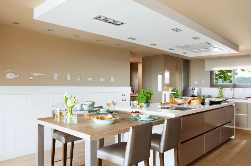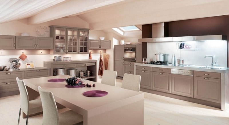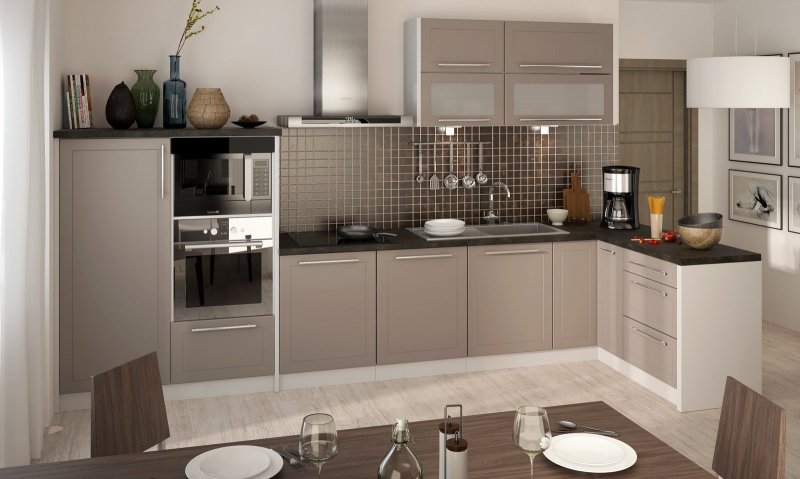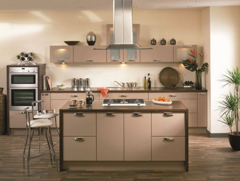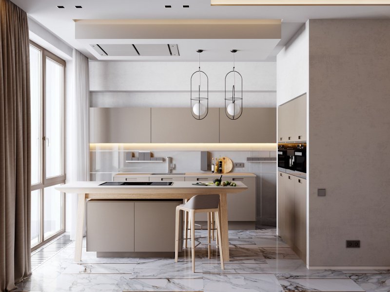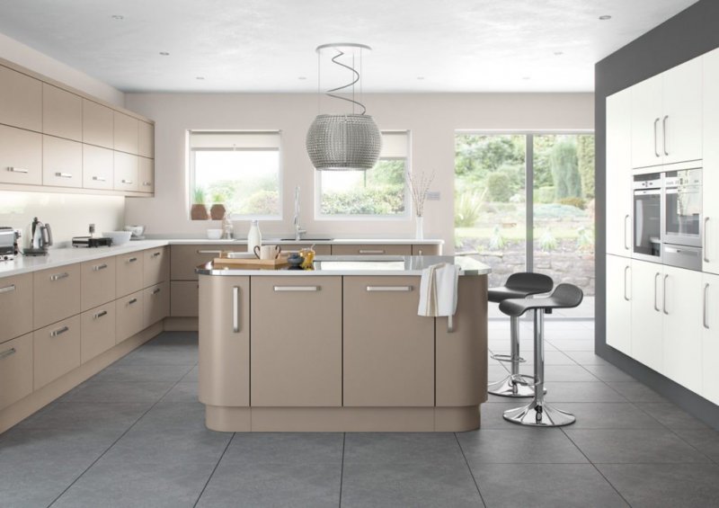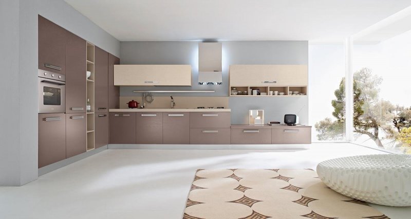 Легкий кофейный цвет используют в минималистских кухнях с целью избежать яркого окраса. Речь идет в том числе о кухнях в квартирах-студиях, где используют каждую возможность разгрузить пространство.