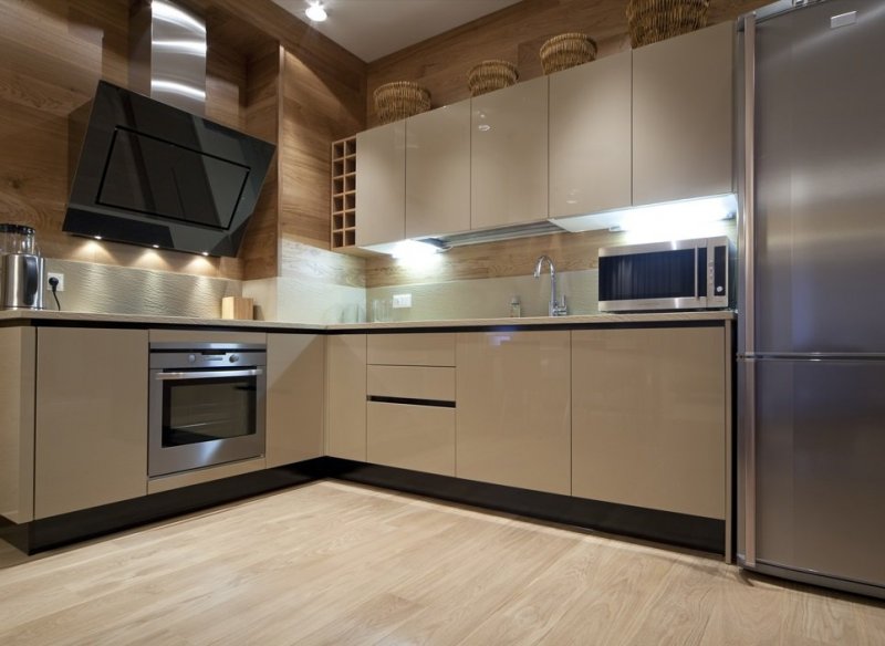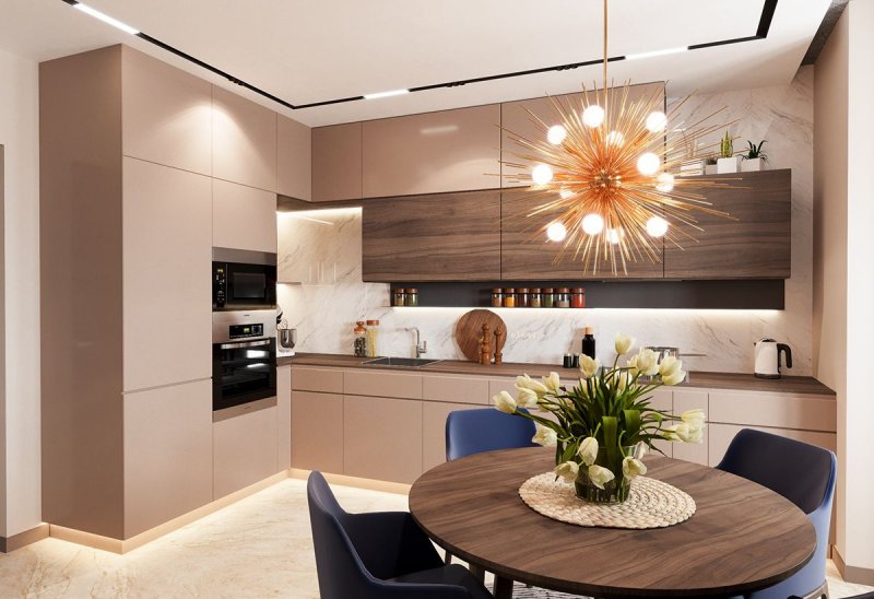 Светло-коричневый оттенок гармонирует с яркой подсветкой и рисунками. На кухне он появляется также вместе с деревянными вставками, холодильниками из дерева.