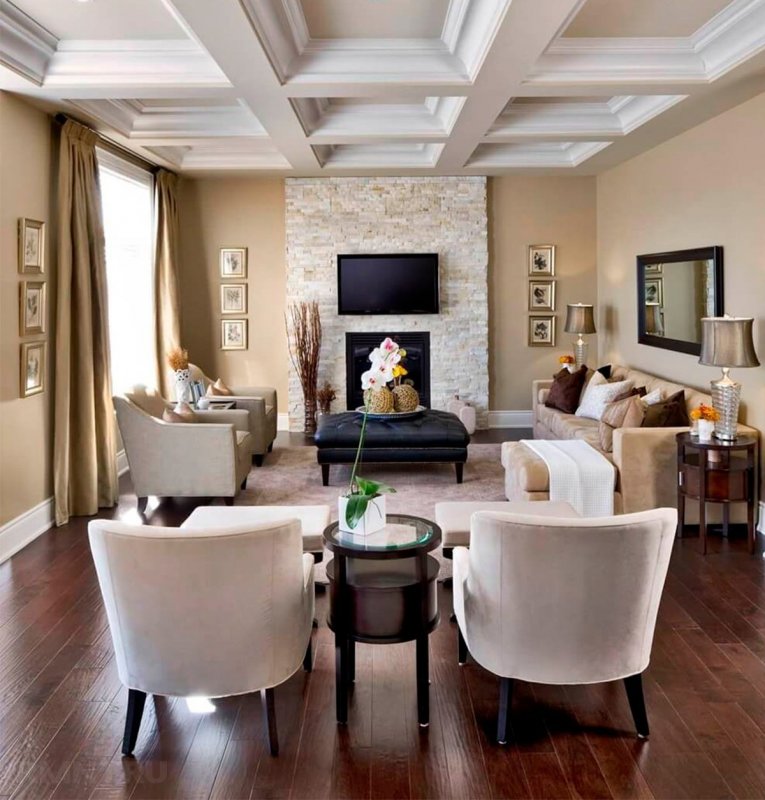 Просторность и статус — вот, что цвет капучино может дать гостиной. Оттенок сочетается с зеркалами, хрусталем, орнаментами, драгоценными камнями, позолотой. Кофейные стены органично подчеркнут уровневый потолок или декоративные элементы на нем. В светло-коричневом дизайне есть ходы для объединения технологических деталей с объектами роскоши воедино. Оттенок капучино обыгрывают со шторами, ставнями, светильниками, коврами, накидками. Часто это получается само собой, ведь эти предметы обычно совпадают по гамме и «приближаются» к светло-коричневому тону.