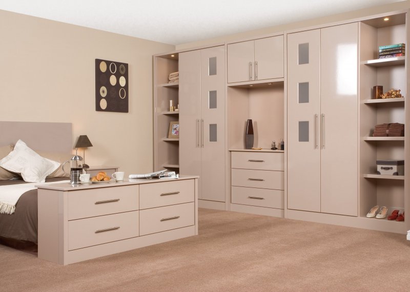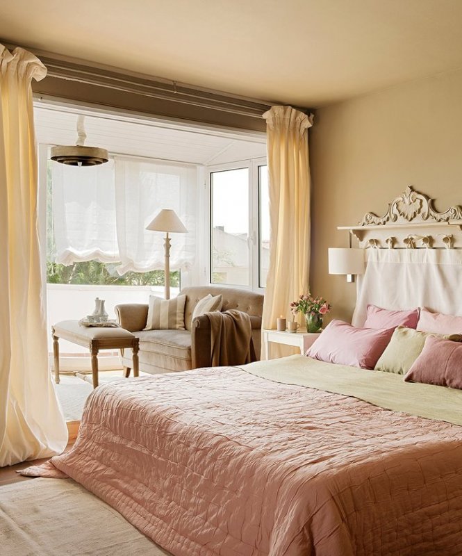Для оттенка капучино нет более подходящего места, чем спальня. В комнате полезными оказываются именно успокаивающие цвета из нейтральной или теплой гаммы. Обитателям приходятся «по вкусу» кофейные стены в окружении белого потолка, пола и текстиля. Цвета капучино бывают и сами ткани, начиная с одеял и заканчивая обивками.