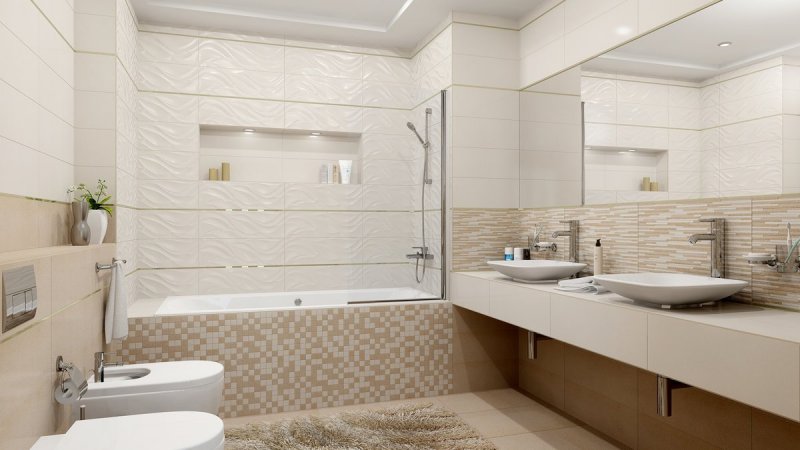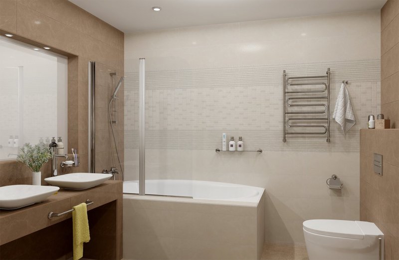 В санузлах нередко применяют комбинацию коричневого и белого цветов и вместо первого порой используют только кофейный. Таким образом подчеркивают фактурность облицовки, делают помещение светлее и просторнее. Насыщать ванную цветом капучино можно и по-другому. Оттенком ширмы, к примеру, картинами.