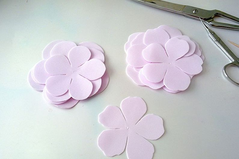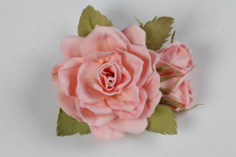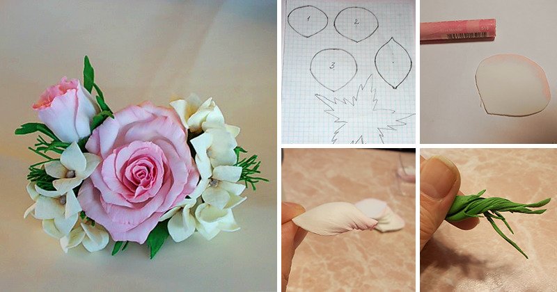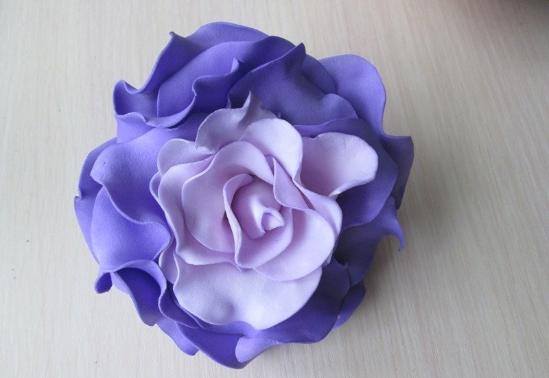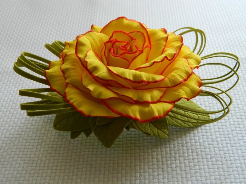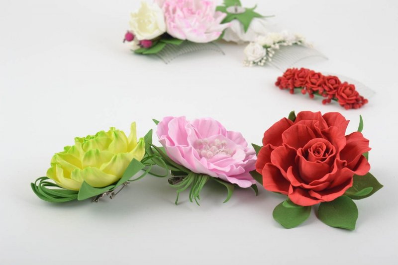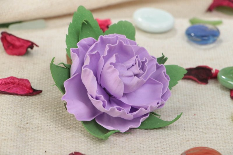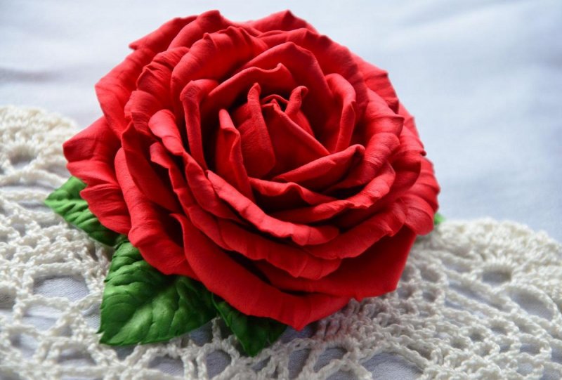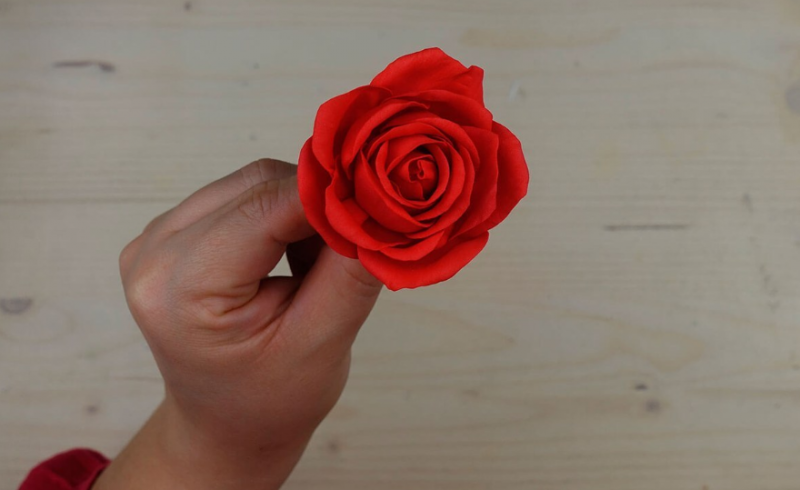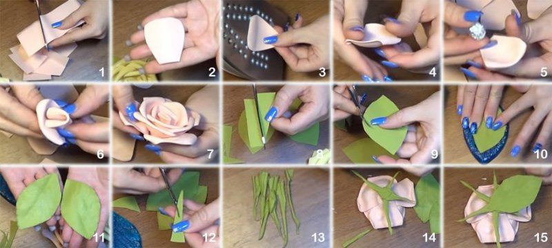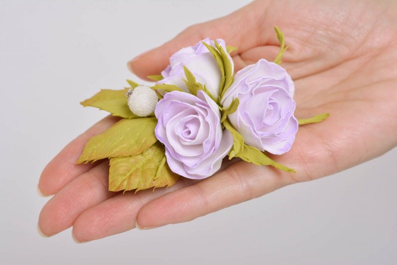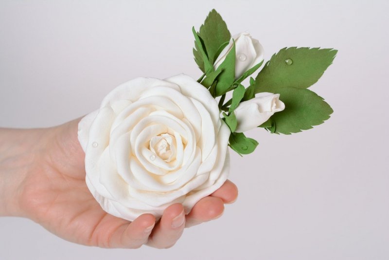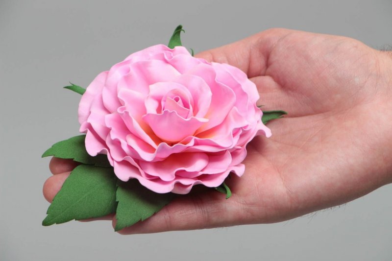 Декоративный вид розы из фоамирана не оставит никого равнодушным. Королеву цветов можно сделать своими руками любого вида и размера. Отлично смотрятся большие интерьерные украшения, миниатюрные бутоны на стеблях в горшочках. Такие эксклюзивные поделки займут достойное место в доме или квартире. Благодаря особым свойствам пенистых листов изделия прослужат долго, не теряя первозданной красоты. Содержание О материале Свойства и применение Необходимые инструменты для работы с фоамираном Легкий способ создания розы для начинающих Как сделать заколку с розой из фоамирана Создание интерьерной розы на стебле Мастер-класс по изготовлению бутона розы Пионовидная роза: пошаговая инструкция Роза в японском стиле Венок из мелких розочек Как и чем тонировать лепестки розы из фоамирана Как ухаживать за изделиями из фоамирана Заключение О материале Фоамиран – бархатистый на вид и на ощупь материал со вспененной структурой. В состав полимера входит винилацетат и этилен. Из-за этих веществ листы пластичной замши имеют резкий запах, пока находятся в упакованном виде. Производство фоамирана стартовало в Иране. Постепенно его переняли предприниматели из Китая и прочих стран. Благодаря легкости обработки, многообразию вариантов использования ревелюр быстро стал популярным. Главное его достоинство – податливость. Материал смягчается, становится готовым к использованию под влиянием невысокой температуры, например, теплоты рук человека. Купить вспененную резину можно в любом магазине с товарами для рукоделия. Чаще можно встретить листовой фоам, стандартного размера – 40 х 60 см. Толщина пластин бывает разной, в зависимости от производителя, не превышает 3 мм. Также возможна и рулонная форма выпуска. Тонкие листы продают в скрученном виде без упаковки. Показатели гибкости и пластичности материала увеличиваются за счет степени пенистости. Качество определяет удобство работы. Чем больше в нем воздушных пузырьков, тем проще из него выкатывать и вытягивать разные фигуры после нагревания. Свойства и применение Фоамиран стал быстро таким популярным благодаря удобной форме выпуска, разнообразию цветов, невысокой цене и своим уникальным свойствам. Он значительно превосходит ткань или бумагу, подходит для создания плоских поделок, объемных фигур, цветов. Декоративному материалу присущи следующие особенности: Он становится мягким под воздействием тепла рук, пламени свечи. Большей пластичности можно достигнуть, приложив элемент к батарее, утюгу; Хорошо держит форму после остывания. Поделки становятся прочными, не деформируются при касании или падении; Вспененную резину можно делать прочной или растягивать, воздействуя различными источниками тепла; Изделия из фоамирана можно подкрашивать различными способами. Для придания натурального оттенка лепесткам цветов используют пастельные мелки, акриловые краски; Пластичную замшу можно резать обычными ножницами, канцелярским ножом; Для соединения нескольких деталей используют клей сильной фиксации, горячий пистолет с клеевым стержнем. Применяют фоам для создания различных поделок, как плоских, так и объемных, декорирования простых предметов, украшения интерьеров. Мелкими цветочками можно оклеить край часов на стене, рамку для фото. Если собрать резиновые лепестки в виде купола, получи