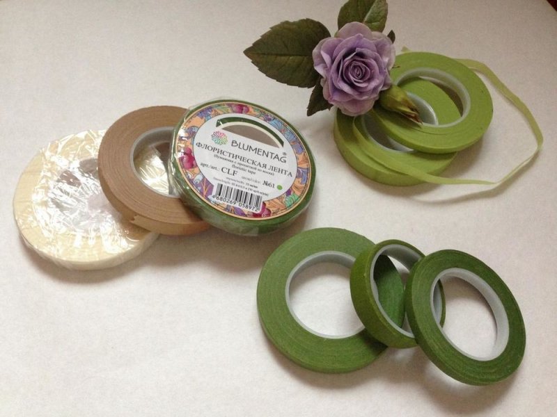 Тейп-лента. Основное назначение – обработка стеблей, декорирование веточек, ножек. Благодаря клейкой основе, при растягивании она отлично фиксируется на проволоке, деревянных палочках, пластике;