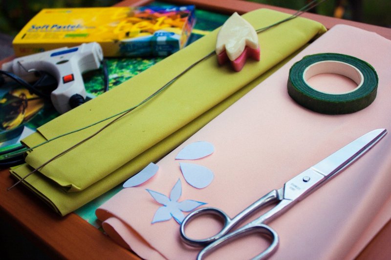 Четко выполняя инструкцию пошагово, можно сделать потрясающую розу любого размера и сложности. Устойчивый цветок на стебле будем делать из фоамирана, флористической проволоки, тейп-ленты. Также потребуется клей «Момент», горячий пистолет, набор с красками, утюг для придания формы листочкам и лепесткам.