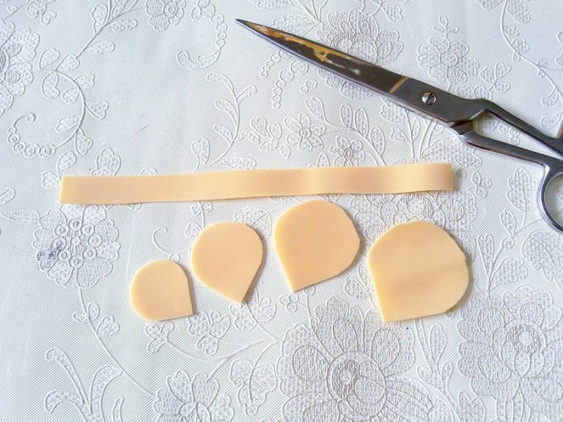 На листе офисной бумаги создаем схему будущих лепестков. Потребуется нарисовать 15-ть деталей в виде капли разного размера. Вырезаем необходимое количество лепестков, от 3-х до 15-ти штук каждого вида, истончаем при желании.