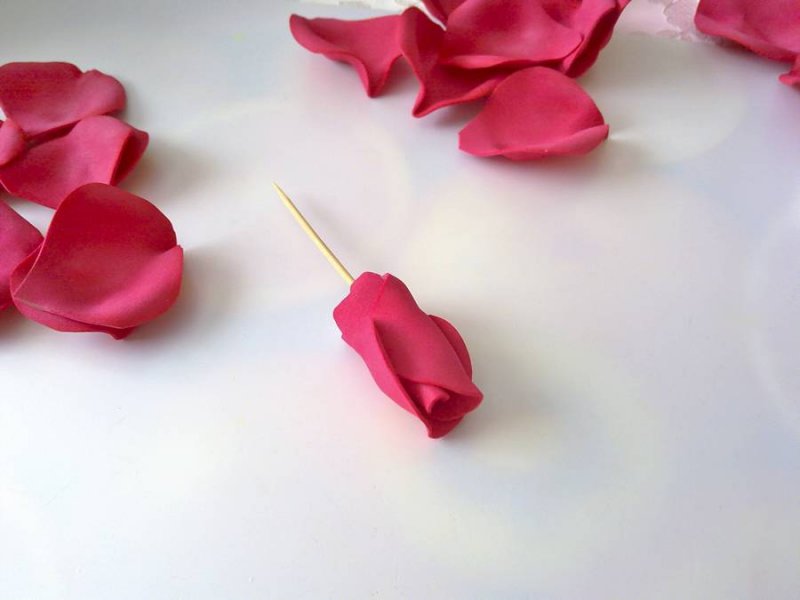 Бутон делаем из нескольких лепесточков. Из пищевой фольги скатываем шарик, надеваем его на зубочистку и начинаем приклеивать лепестки. Самую маленькую лепестковую деталь одеваем на палочку, приклеиваем у основания. Теперь фиксируем лепестки к центральному бутону в шахматном порядке. Когда один ряд будет оформлен, приступаем к следующей детали и действуем по аналогии с предыдущими лепестками.