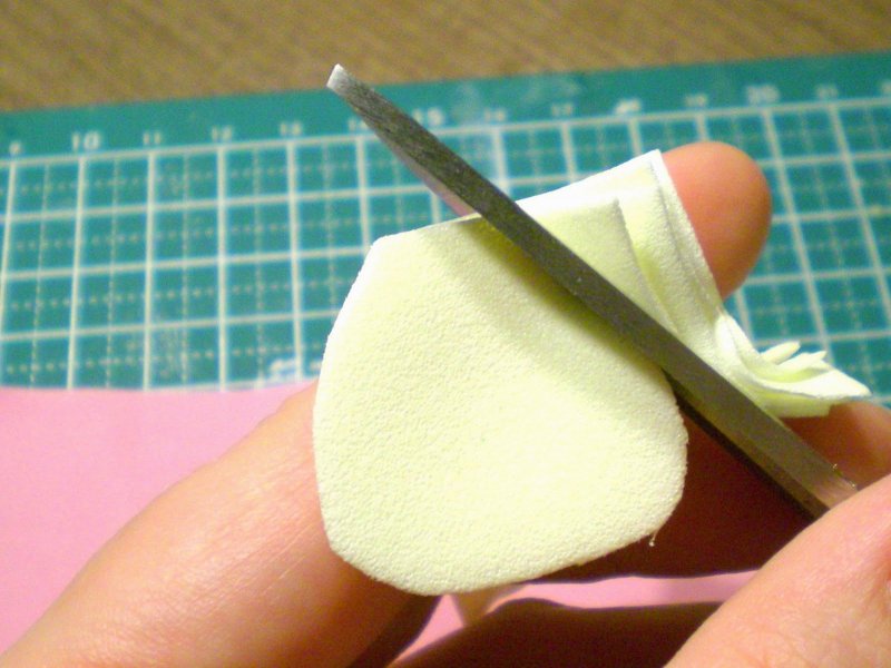 Прикладываем шаблоны к фоамирану, очерчиваем контуры с помощью зубочистки. Вырезаем по одной детали каждого размера. При желании края лепестков можно подкрасить. Нагреваем утюг и прикладываем заготовки по одной, растягивающими движениями придаем выпуклость, подкручиваем края в обратную сторону.