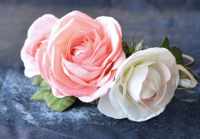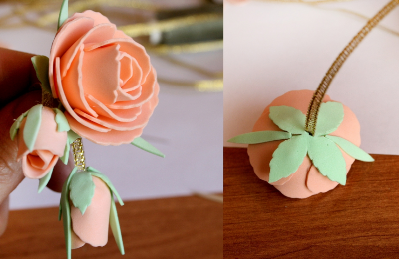 Вырезам заготовки лепестков, при желании тонируем. После тепловой обработки придаем им нужную реалистичную форму, для листиков используем молды. Разделяем проволоку на несколько равных частей, на конец каждой крепим фольгированную основу и собираем лепестки в закрытые розочки, крепим листики. Таким способом делаем 10-15 заготовок на проволочных ножках. Количество зависит от схемы сбора ободка. К толстой проволоке прикладываем заготовки, приматываем тейп-лентой.